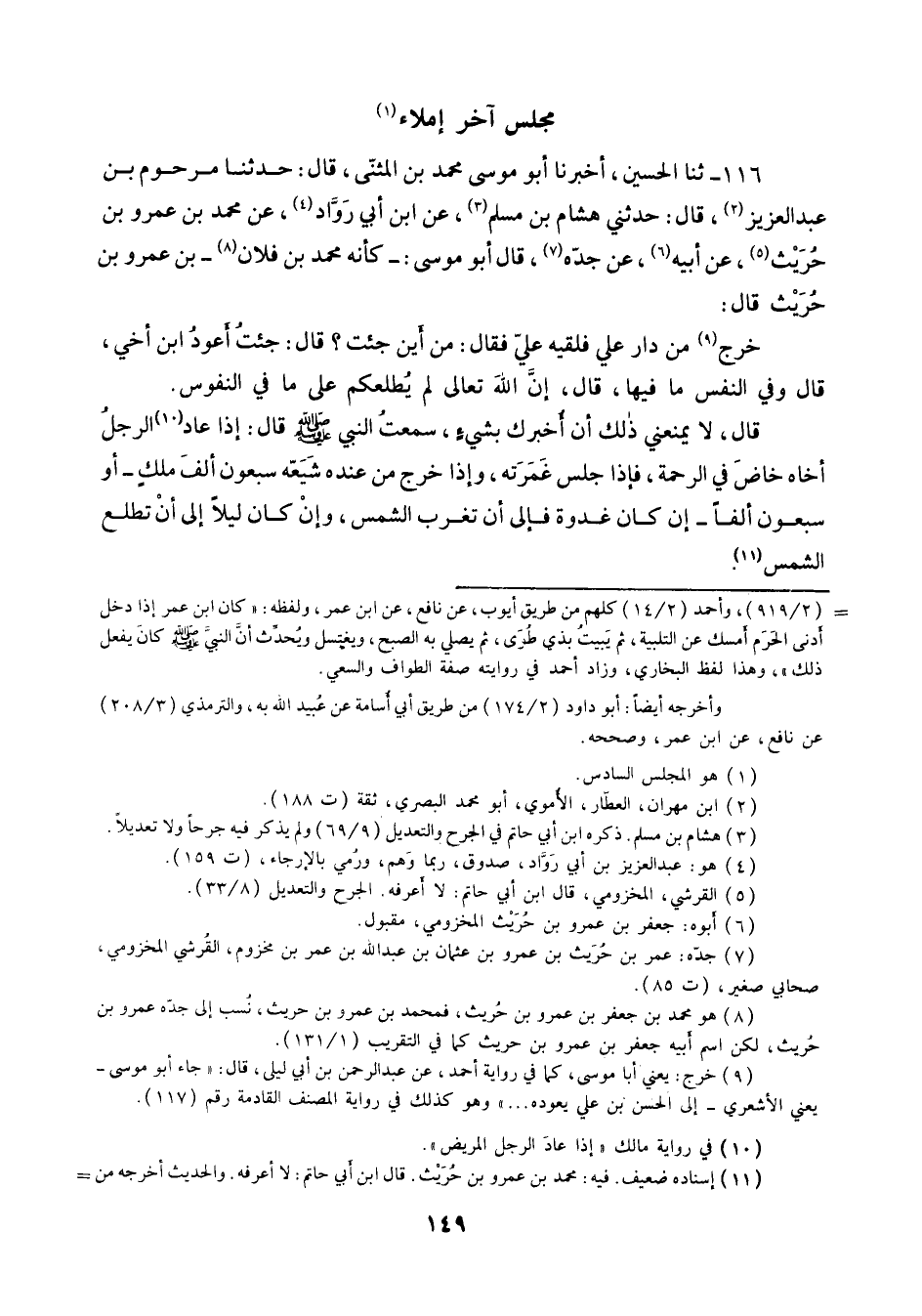 116 - ثنا الْحُسَيْنُ أَخْبَرَنَا أَبُو مُوسَى مُحَمَّدُ بْنُ الْمُثَنَّى قَالَ: حَدَّثَنَا مَرْحُومُ بْنُ عَبْدِ الْعَزِيزِ قَالَ: حَدَّثَنِي هِشَامُ بْنُ مُسْلِمٍ، عَنِ ابْنِ أَبِي رَوَّادٍ، عَنْ مُحَمَّدِ بْنِ عَمْرِو بْنِ حُرَيْثٍ، عَنْ أَبِيهِ، عَنْ جَدِّهِ، قَالَ أَبُو مُوسَى: كَأَنَّهُ مُحَمَّدُ بْنُ فُلَانِ بْنِ عَمْرِو بْنِ حُرَيْثٍ قَالَ: خَرَجَ مِنْ دَارِ عَلِيٍّ فَلَقِيَهُ عَلِيٌّ فَقَالَ: مِنْ أَيْنَ جِئْتَ؟ قَالَ: جِئْتُ أَعُودُ ابْنَ أَخِي، قَالَ: وَفِي النَّفْسِ مَا فِيهَا، قَالَ: إِنَّ اللَّهَ تَعَالَى لَمْ يُطْلِعْكُمْ عَلَى مَا فِي النُّفُوسِ، قَالَ: لَا يَمْنَعُنِي ذَلِكَ أَنْ أُخْبِرَكَ بِشَيْءٍ سَمِعْتُ النَّبِيَّ صَلَّى اللهُ عَلَيْهِ وَسَلَّمَ قَالَ: «§إِذَا عَادَ الرَّجُلُ أَخَاهُ خَاضَ فِي الرَّحْمَةِ , فَإِذَا جَلَسَ غَمَرَتْهُ , وَإِذَا خَرَجَ مِنْ عِنْدِهِ شَيَّعَهُ سَبْعُونَ أَلْفَ مَلَكٍ أَوْ سَبْعُونَ أَلْفًا، إِنْ كَانَ غُدْوَةً فَإِلَى أَنْ تَغْرُبَ الشَّمْسُ , وَإِنْ كَانَ لَيْلًا إِلَى أَنْ تَطْلُعَ الشَّمْسُ»