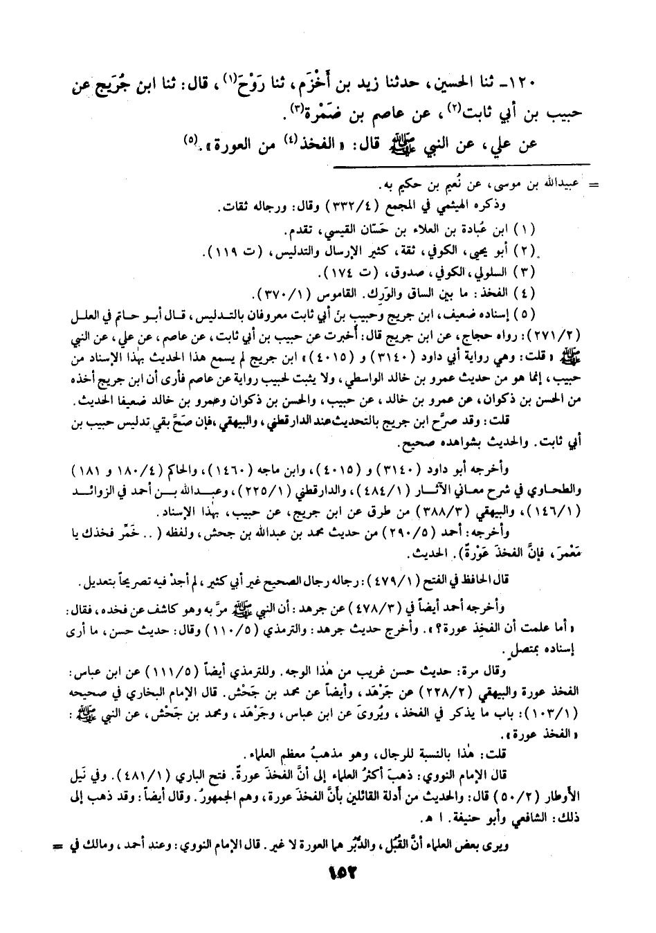 120 - ثنا الْحُسَيْنُ حَدَّثَنَا زَيْدُ بْنُ أَخْزَمَ، ثنا رَوْحٌ قَالَ: ثنا ابْنُ جُرَيْجٍ، عَنْ حَبِيبِ بْنِ أَبِي ثَابِتٍ، عَنْ عَاصِمِ بْنِ ضَمْرَةَ، عَنْ عَلِيٍّ عَنِ النَّبِيِّ صَلَّى اللهُ عَلَيْهِ وَسَلَّمَ قَالَ: «§الْفَخِذُ مِنَ الْعَوْرَةِ»
