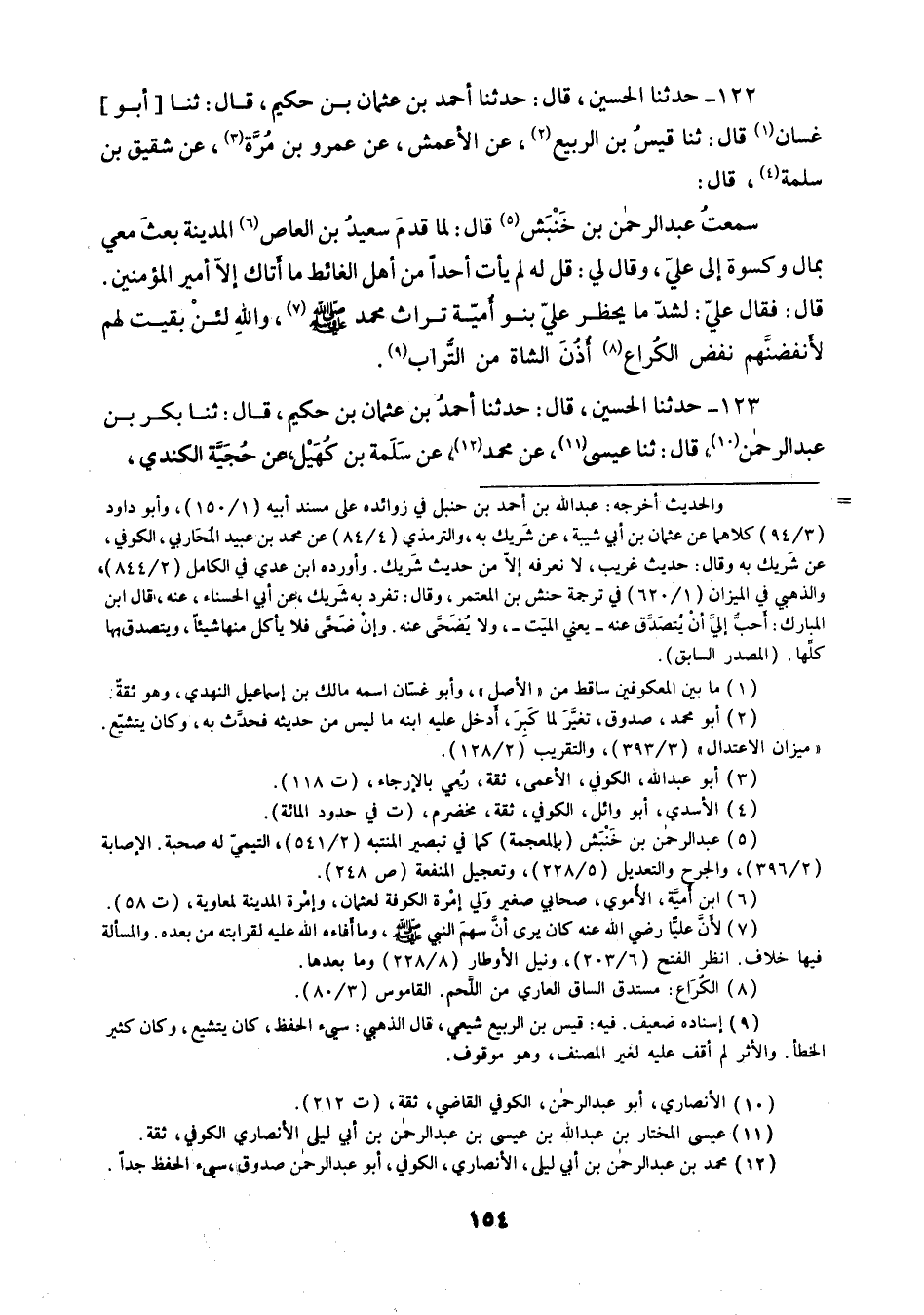 122 - حَدَّثَنَا الْحُسَيْنُ قَالَ حَدَّثَنَا أَحْمَدُ بْنُ عُثْمَانَ بْنِ حَكِيمٍ قَالَ: ثنا أَبُو غَسَّانَ قَالَ: ثنا قَيْسُ بْنُ الرَّبِيعِ، عَنِ الْأَعْمَشِ، عَنْ عَمْرِو بْنِ مُرَّةَ، عَنْ شَقِيقِ بْنِ سَلَمَةَ قَالَ: سَمِعْتُ عَبْدَ الرَّحْمَنِ بْنَ خَنْبَشٍ قَالَ: لَمَّا قَدِمَ سَعِيدُ بْنُ الْعَاصِ الْمَدِينَةَ بَعَثَ مَعِي بِمَالٍ وَكِسْوَةٍ إِلَى عَلِيٍّ , وَقَالَ لِي: قُلْ لَهُ: لَمْ يَأْتِ أَحَدًا مِنْ أَهْلِ الْغَائِطِ مَا أَتَاكَ إِلَّا أَمِيرُ الْمُؤْمِنِينَ. قَالَ: فَقَالَ عَلِيٌّ: «§لَشَدَّ مَا يَحْظُرُ عَلَيَّ بَنُو أُمَيَّةَ تُرَاثَ مُحَمَّدٍ صَلَّى اللهُ عَلَيْهِ وَسَلَّمَ , وَاللَّهِ لَئِنْ بَقِيتُ لَهُمْ لَأَنْفُضَنَّهُمْ نَفْضَ الْكُرَاعِ أُذُنَ الشَّاةِ مِنَ التُّرَابِ»