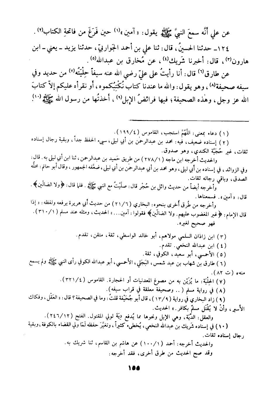 124 - حَدَّثَنَا الْحُسَيْنُ قَالَ ثنا عَلِيُّ بْنُ أَحْمَدَ الْجَوَارِبِيُّ، حَدَّثَنَا يَزِيدُ يَعْنِي ابْنَ هَارُونَ قَالَ: أَخْبَرَنَا شَرِيكٌ، عَنْ مُخَارِقِ بْنِ عَبْدِ اللَّهِ، عَنْ طَارِقٍ قَالَ: أَنَا رَأَيْتُ عَلَى عَلِيٍّ رَضِيَ اللَّهُ عَنْهُ سَيْفًا حِلْيَتُهُ مِنْ حَدِيدٍ , وَفِي سَيْفِهِ صَحِيفَةٌ , وَهُوَ يَقُولُ: «وَاللَّهِ , §مَا عِنْدَنَا كِتَابٌ نُكْتِبُكُمُوهُ أَوْ نَقْرَأَهُ عَلَيْكُمْ إِلَّا كِتَابَ اللَّهِ عَزَّ وَجَلَّ وَهَذِهِ الصَّحِيفَةُ فِيهَا فَرَائِضُ الْإِبِلِ أَخَذْتُهَا مِنْ رَسُولِ اللَّهِ صَلَّى اللهُ عَلَيْهِ وَسَلَّمَ»