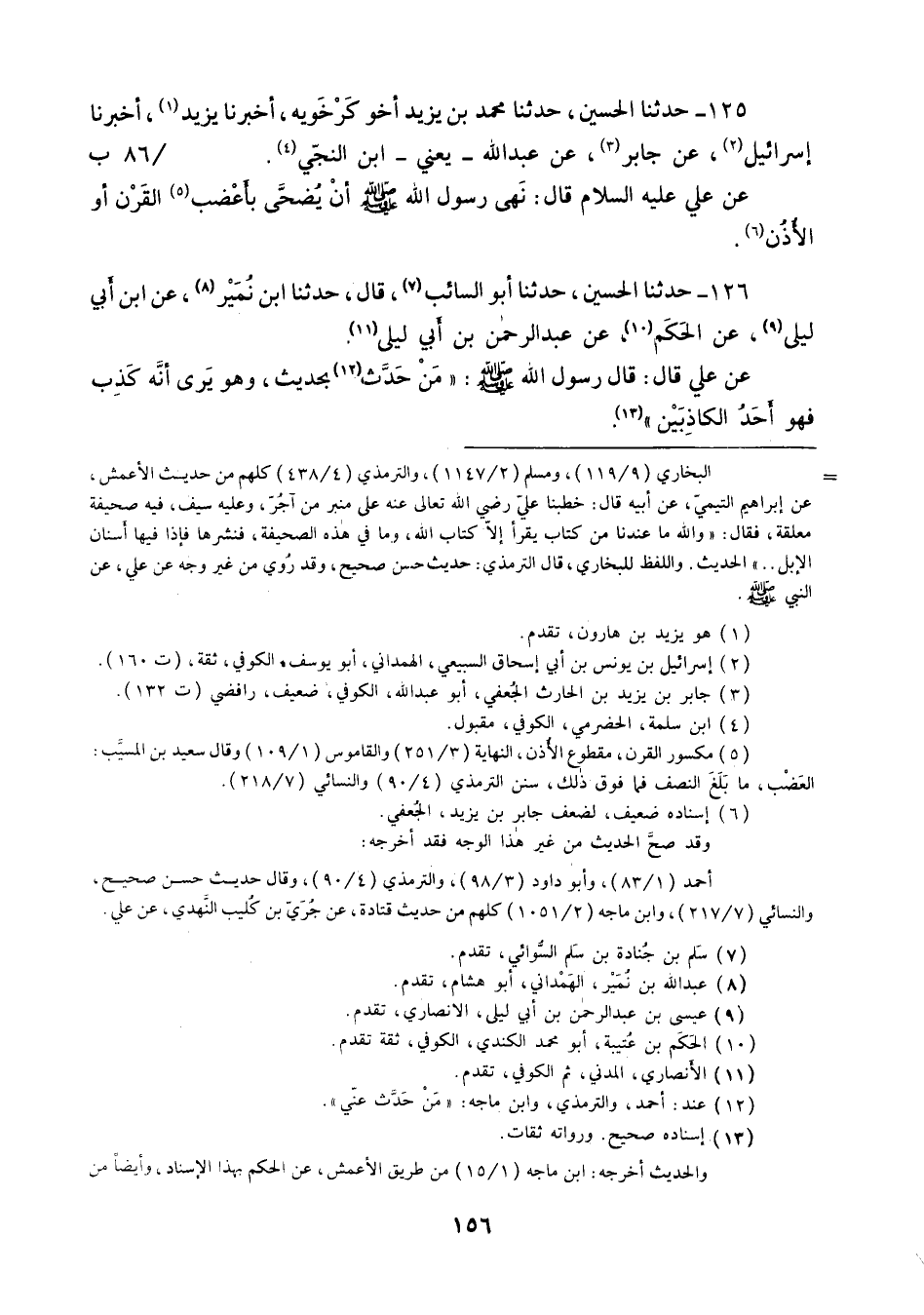 126 - حَدَّثَنَا الْحُسَيْنُ حَدَّثَنَا أَبُو السَّائِبِ قَالَ: حَدَّثَنَا ابْنُ نُمَيْرٍ، عَنِ ابْنِ أَبِي لَيْلَى، عَنِ الْحَكَمِ، عَنْ عَبْدِ الرَّحْمَنِ بْنِ أَبِي لَيْلَى، عَنْ عَلِيٍّ قَالَ: قَالَ رَسُولُ اللَّهِ صَلَّى اللهُ عَلَيْهِ وَسَلَّمَ: «§مَنْ حَدَّثَ بِحَدِيثٍ وَهُوَ يَرَى أَنَّهُ كَذِبٌ فَهُوَ أَحَدُ الْكَاذِبِينَ»