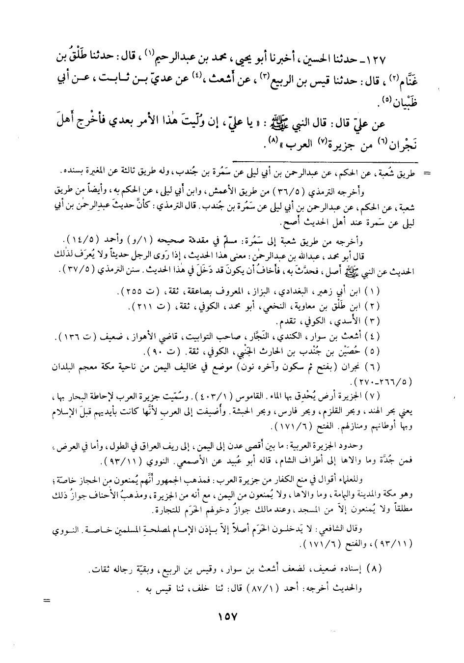 127 - حَدَّثَنَا الْحُسَيْنُ أَخْبَرَنَا أَبُو يَحْيَى مُحَمَّدُ بْنُ عَبْدِ الرَّحِيمِ قَالَ: حَدَّثَنَا طَلْقُ بْنُ غَنَّامٍ قَالَ: حَدَّثَنَا قَيْسُ بْنُ الرَّبِيعِ، عَنْ أَشْعَثَ، عَنْ عَدِيِّ بْنِ ثَابِتٍ، عَنْ أَبِي ظَبْيَانَ، عَنْ عَلِيٍّ قَالَ: قَالَ النَّبِيُّ صَلَّى اللهُ عَلَيْهِ وَسَلَّمَ: «يَا عَلِيُّ , §إِنْ وُلِّيتَ هَذَا الْأَمْرَ بَعْدِي , فَأَخْرِجْ أَهْلَ نَجْرَانَ مِنْ جَزِيرَةِ الْعَرَبِ»
