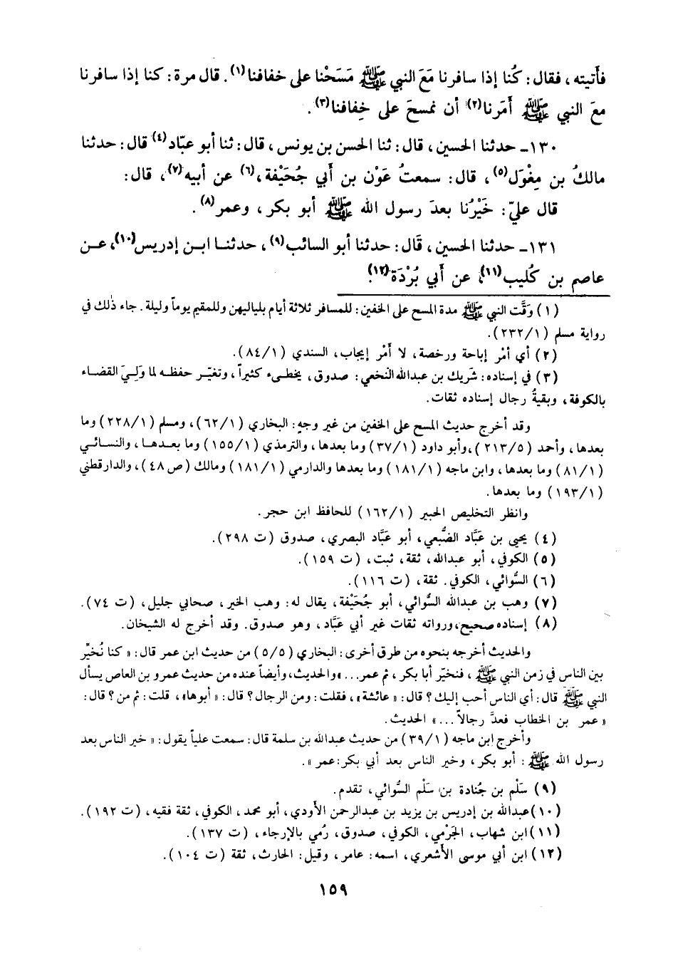 130 - حَدَّثَنَا الْحُسَيْنُ قَالَ ثنا الْحَسَنُ بْنُ يُونُسَ قَالَ: ثنا أَبُو عَبَّادٍ قَالَ: حَدَّثَنَا مَالِكُ بْنُ مِغْوَلٍ قَالَ: سَمِعْتُ عَوْنَ بْنَ أَبِي جُحَيْفَةَ، عَنْ أَبِيهِ قَالَ: قَالَ عَلِيٌّ: " §خَيْرُنَا بَعْدَ رَسُولِ اللَّهِ صَلَّى اللهُ عَلَيْهِ وَسَلَّمَ: أَبُو بَكْرٍ وَعُمَرُ "