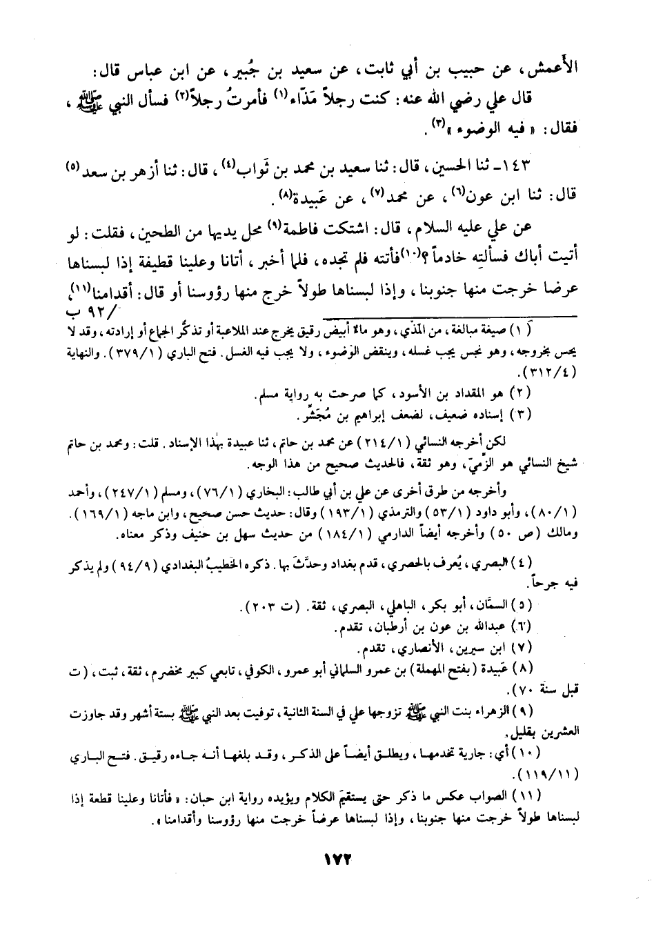 143 - ثنا الْحُسَيْنُ قَالَ ثنا سَعِيدُ بْنُ مُحَمَّدِ بْنِ ثَوَابٍ قَالَ: ثنا أَزْهَرُ بْنُ سَعْدٍ قَالَ: ثنا ابْنُ عَوْنٍ، عَنْ مُحَمَّدٍ، عَنْ عُبَيْدَةَ، عَنْ عَلِيٍّ عَلَيْهِ السَّلَامُ قَالَ: اشْتَكَتْ فَاطِمَةُ مَحْلَ يَدَيْهَا مِنَ الطَّحِينِ , فَقُلْتُ: لَوْ أَتَيْتِ أَبَاكِ , فَسَأَلْتِهِ خَادِمًا؟ فَأَتَتْهُ , فَلَمْ تَجِدْهُ , فَلَمَّا أُخْبِرَ أَتَانَا وَعَلَيْنَا قَطِيفَةٌ إِذَا لَبِسْنَاهَا عَرْضًا خَرَجَتْ مِنْهَا جُنُوبُنَا , وَإِذَا لَبِسْنَاهَا طُولًا خَرَجَ مِنْهَا رُءُوسُنَا أَوْ قَالَ: أَقْدَامُنَا , -[173]- فَقَالَ: «§نُبِّئْتُ يَا فَاطِمَةُ , أَنَّكِ جِئْتِ , فَهَلْ كَانَتْ لَكِ حَاجَةٌ؟» قُلْتُ: بَلَى شَكَتْ إِلَيَّ مَحْلَ يَدَيْهَا مِنَ الطَّحِينِ , فَقُلْتُ: لَوْ أَتَيْتِ أَبَاكِ , فَسَأَلْتِهِ خَادِمًا؟ قَالَ: «أَفَلَا أَدُلُّكُمَا عَلَى مَا هُوَ خَيْرٌ لَكُمَا مِنَ الْخَادِمِ إِذَا أَوَيْتُمَا إِلَى فِرَاشِكُمَا هَذَا , فَقُولَا ثَلَاثًا وَثَلَاثِينَ , وَثَلَاثًا وَثَلَاثِينَ , وَأَرْبَعًا وَثَلَاثِينَ مِنْ تَسْبِيحٍ , وَتَحْمِيدٍ , وَتَكْبِيرٍ فَذَلِكَ خَيْرٌ لَكُمَا مِمَّا سَأَلْتُمَا»