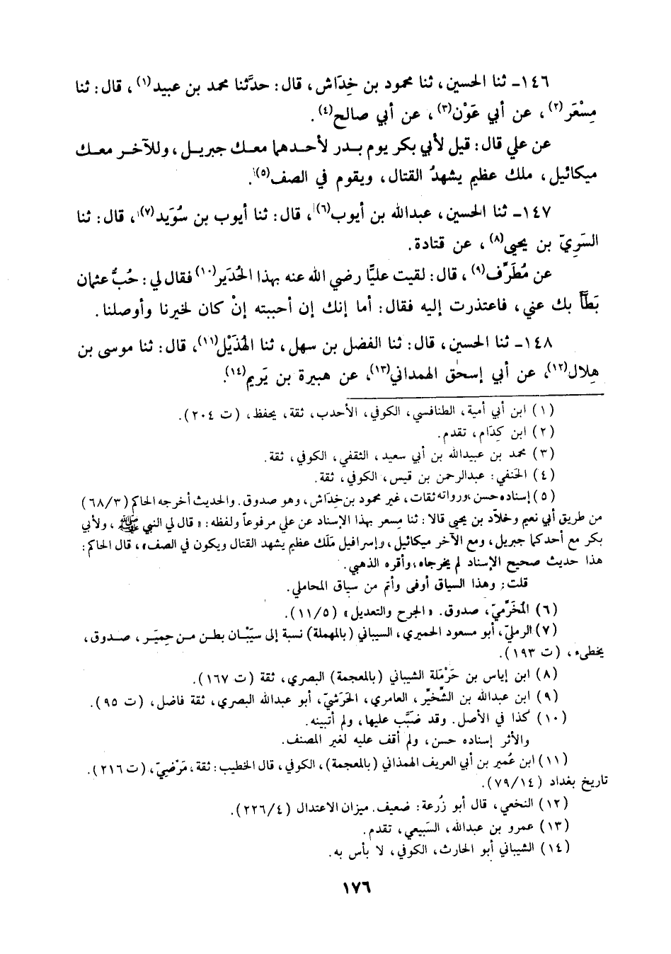 146 - ثنا الْحُسَيْنُ ثنا مَحْمُودُ بْنُ خِدَاشٍ قَالَ: حَدَّثَنَا مُحَمَّدُ بْنُ عُبَيْدٍ قَالَ: ثنا مِسْعَرٌ، عَنْ أَبِي عَوْنٍ، عَنْ أَبِي صَالِحٍ، عَنْ عَلِيٍّ قَالَ: قِيلَ لِأَبِي بَكْرٍ يَوْمَ بَدْرٍ لِأَحَدِهِمَا §مَعَكَ جِبْرِيلُ وَلِلْآخَرِ مَعَكَ مِيكَائِيلُ مَلَكٌ عَظِيمٌ يَشْهَدُ الْقِتَالَ وَيَقُومُ فِي الصَّفِّ "