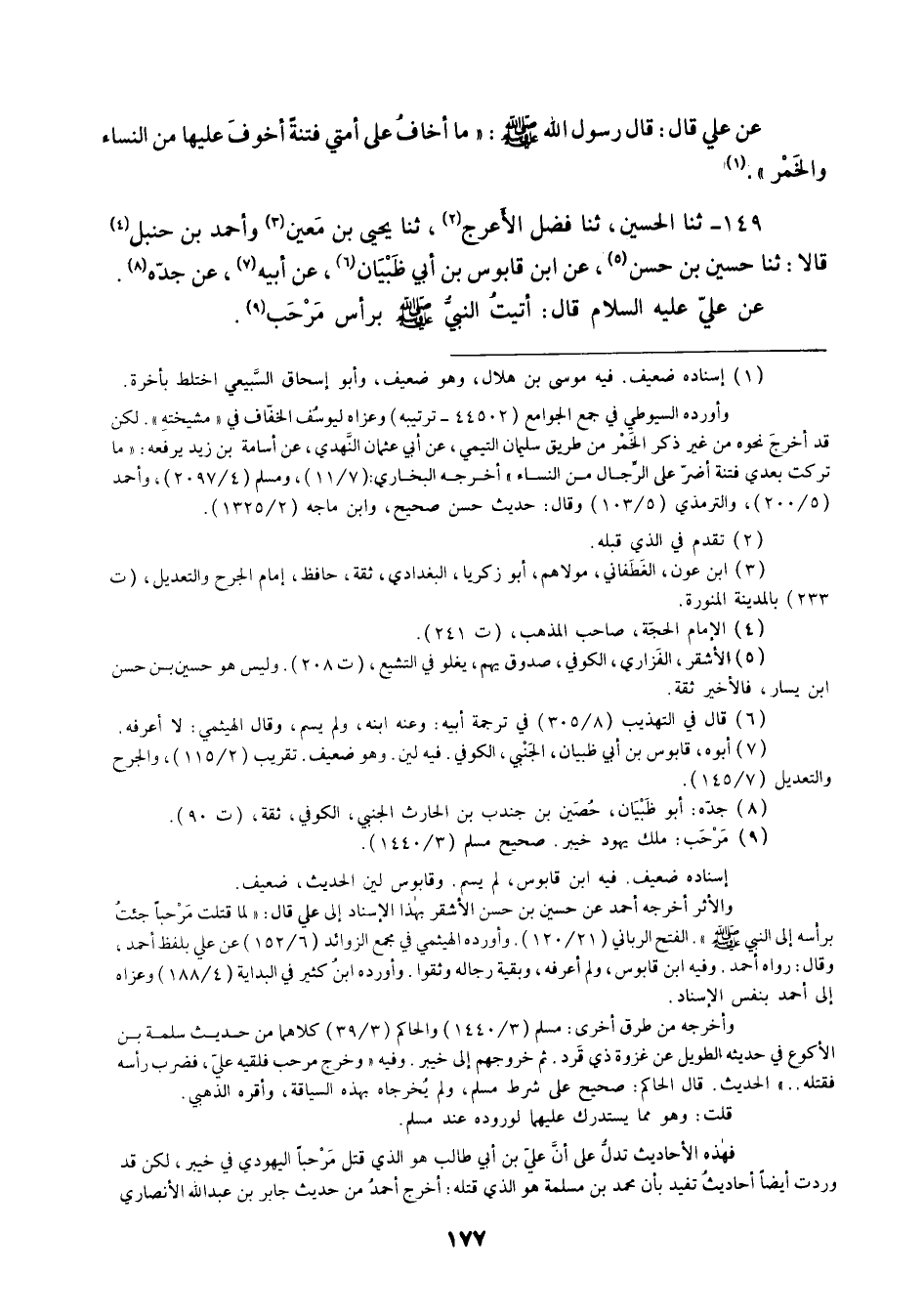149 - ثنا الْحُسَيْنُ ثنا فَضْلٌ الْأَعْرَجُ، ثنا يَحْيَى بْنُ مَعِينٍ، وأَحْمَدُ بْنُ حَنْبَلٍ قَالَا: ثنا حُسَيْنُ بْنُ حَسَنٍ، عَنِ ابْنِ قَابُوسَ بْنِ أَبِي ظَبْيَانَ، عَنْ أَبِيهِ، عَنْ جَدِّهِ، عَنْ عَلِيٍّ عَلَيْهِ السَّلَامُ قَالَ: " §أَتَيْتُ النَّبِيَّ صَلَّى اللهُ عَلَيْهِ وَسَلَّمَ: بِرَأْسِ مَرْحَبٍ "