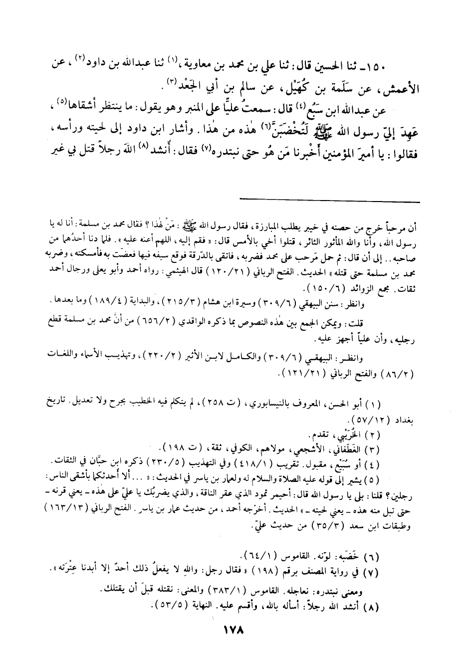 150 - ثنا الْحُسَيْنُ قَالَ ثنا عَلِيُّ بْنُ مُحَمَّدِ بْنِ مُعَاوِيَةَ، ثنا عَبْدُ اللَّهِ بْنُ دَاوُدَ، عَنِ الْأَعْمَشِ، عَنْ سَلَمَةَ بْنِ كُهَيْلٍ، عَنْ سَالِمِ بْنِ أَبِي الْجَعْدِ، عَنْ عَبْدِ اللَّهِ بْنِ سَبُعٍ قَالَ: سَمِعْتُ عَلِيًّا عَلَى الْمِنْبَرِ وَهُوَ يَقُولُ: مَا يَنْتَظِرُ أَشْقَاهَا , عَهِدَ إِلَيَّ رَسُولُ اللَّهِ صَلَّى اللهُ عَلَيْهِ وَسَلَّمَ: «§لَتُخْضَبَنَّ هَذِهِ مِنْ هَذَا» , وَأَشَارَ ابْنُ دَاوُدَ إِلَى لِحْيَتِهِ وَرَأْسِهِ , فَقَالُوا: يَا أَمِيرَ الْمُؤْمِنِينَ , أَخْبِرْنَا مَنْ هُوَ حَتَّى نَبْتَدِرَهُ , فَقَالَ: أَنْشُدُ اللَّهَ رَجُلًا قَتَلَ بِي غَيْرَ -[179]- قَاتِلِي قَالُوا: أَلَا تَسْتَخْلِفُ؟ قَالَ: ابْنُ دَاوُدَ وَسَقَطَ عَلَيَّ مَا بَعْدَ هَذَا