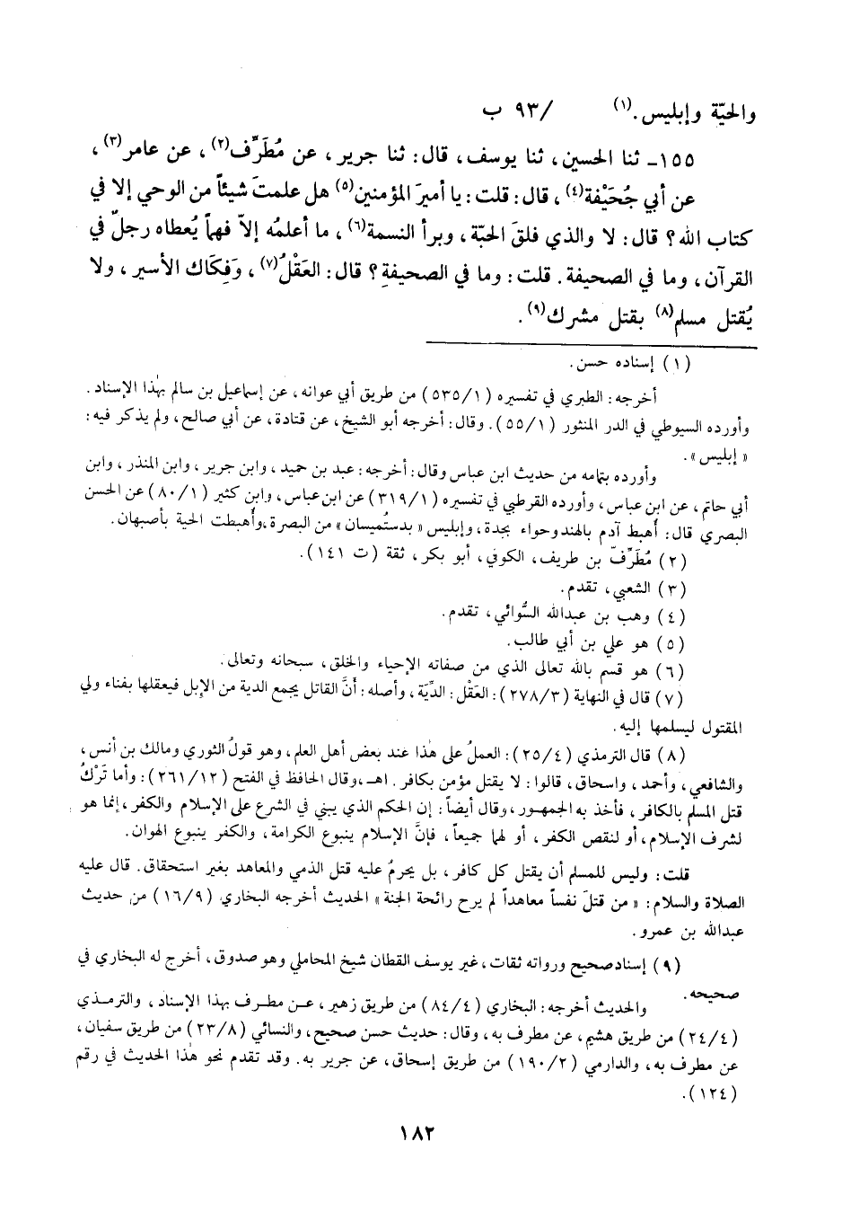 155 - ثنا الْحُسَيْنُ ثنا يُوسُفُ قَالَ: ثنا جَرِيرٌ، عَنْ مُطَرِّفٍ، عَنْ عَامِرٍ، عَنْ أَبِي جُحَيْفَةَ قَالَ: قُلْتُ يَا أَمِيرَ الْمُؤْمِنِينَ , §هَلْ عَلِمْتَ شَيْئًا مِنَ الْوَحْيِ إِلَّا فِي كِتَابِ اللَّهِ؟ قَالَ: " لَا , وَالَّذِي فَلَقَ الْحَبَّةَ , وَبَرَأَ النَّسَمَةَ مَا أَعْلَمُهُ إِلَّا فَهْمًا يُعْطَاهُ رَجُلٌ فِي الْقُرْآنِ , وَمَا فِي الصَّحِيفَةِ قُلْتُ: وَمَا فِي الصَّحِيفَةِ؟ قَالَ: الْعَقْلُ , وَفِكَاكُ الْأَسِيرِ , وَلَا يُقْتَلُ مُسْلِمٌ بِقَتْلِ مُشْرِكٍ "
