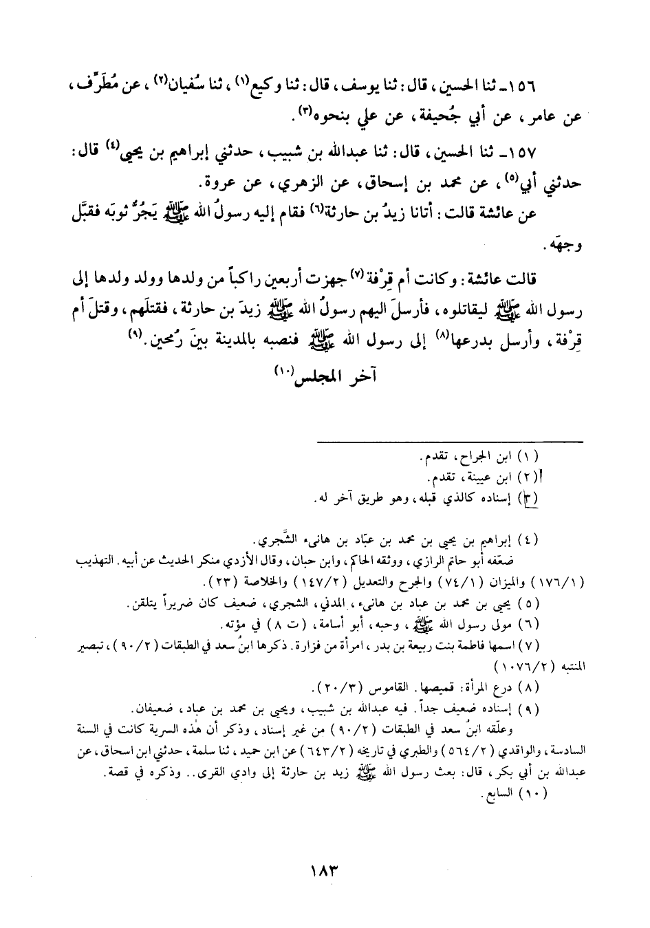 157 - ثنا الْحُسَيْنُ قَالَ ثنا عَبْدُ اللَّهِ بْنُ شَبِيبٍ، حَدَّثَنِي إِبْرَاهِيمُ بْنُ يَحْيَى قَالَ: حَدَّثَنِي أَبِي، عَنْ مُحَمَّدِ بْنِ إِسْحَاقَ، عَنِ الزُّهْرِيِّ، عَنْ عُرْوَةَ، عَنْ عَائِشَةَ قَالَتْ: §أَتَانَا زَيْدُ بْنُ حَارِثَةَ , «فَقَامَ إِلَيْهِ رَسُولُ اللَّهِ صَلَّى اللهُ عَلَيْهِ وَسَلَّمَ يَجُرُّ ثَوْبَهُ , فَقَبَّلَ وَجْهَهُ» قَالَتْ عَائِشَةُ: وَكَانَتْ أُمُّ قِرْفَةَ جَهَّزَتْ أَرْبَعِينَ رَاكِبًا مِنْ وَلَدِهَا وَوَلَدِ وَلَدِهَا إِلَى رَسُولِ اللَّهِ صَلَّى اللهُ عَلَيْهِ وَسَلَّمَ لِيُقَاتِلُوهُ , «فَأَرْسَلَ إِلَيْهِمْ رَسُولُ اللَّهِ صَلَّى اللهُ عَلَيْهِ وَسَلَّمَ زَيْدَ بْنَ حَارِثَةَ , فَقَتَلَهُمْ , وَقَتْلَ أُمَّ قِرْفَةَ , وَأَرْسَلَ بِدِرْعِهَا إِلَى رَسُولِ اللَّهِ صَلَّى اللهُ عَلَيْهِ وَسَلَّمَ , فَنَصَبَهُ بِالْمَدِينَةِ بَيْنَ رُمْحَيْنِ»