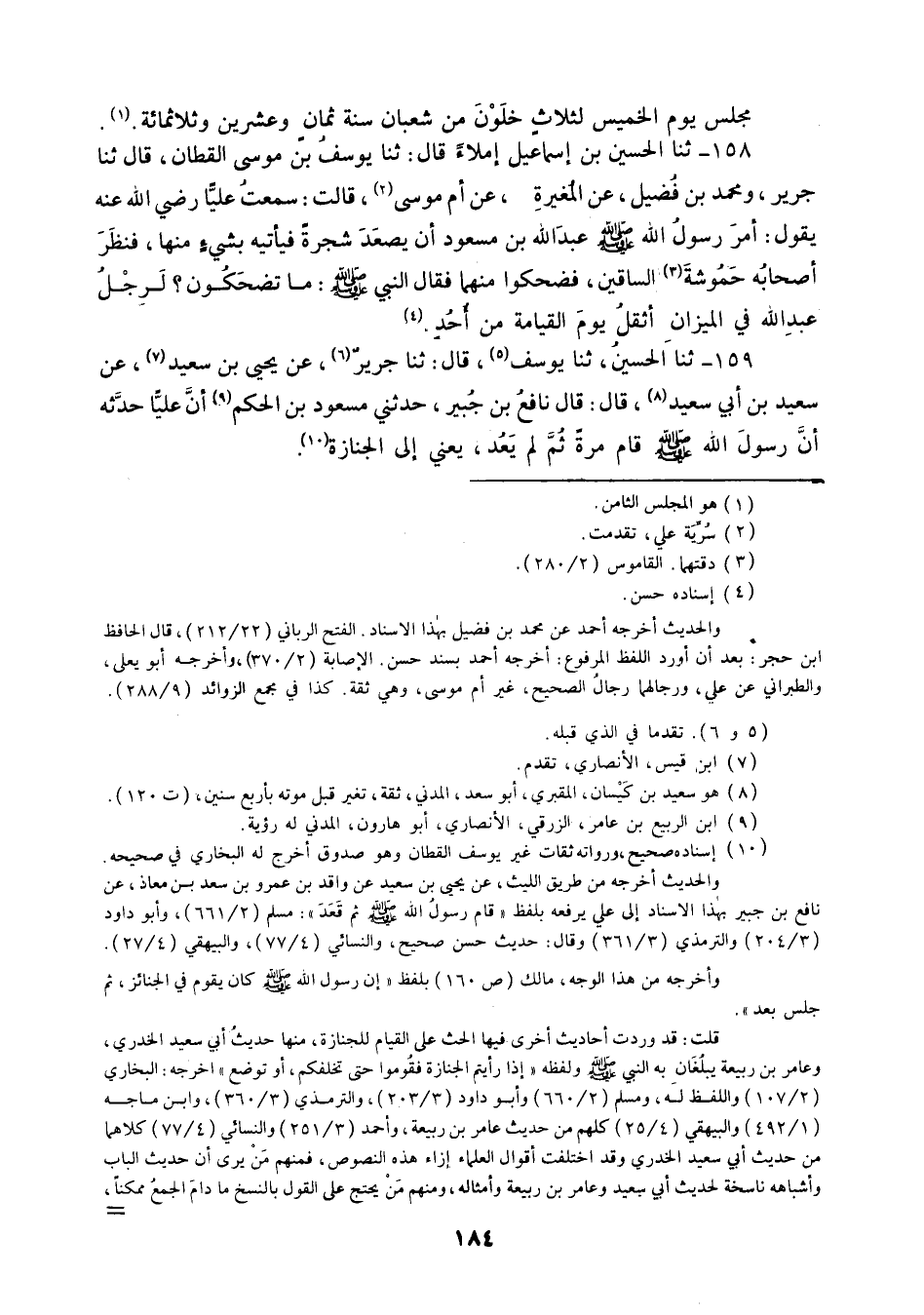 159 - ثنا الْحُسَيْنُ قال ثنا يُوسُفُ قَالَ: ثنا جَرِيرٌ، عَنْ يَحْيَى بْنِ سَعِيدٍ، عَنْ سَعِيدِ بْنِ أَبِي سَعِيدٍ قَالَ: قَالَ نَافِعُ بْنُ جُبَيْرٍ: حَدَّثَنِي مَسْعُودُ بْنُ الْحَكَمِ، أَنَّ عَلِيًّا حَدَّثَهُ: «أَنَّ رَسُولَ اللَّهِ صَلَّى اللهُ عَلَيْهِ وَسَلَّمَ §قَامَ مَرَّةً , ثُمَّ لَمْ يَعُدْ يَعْنِي إِلَى الْجِنَازَةِ»