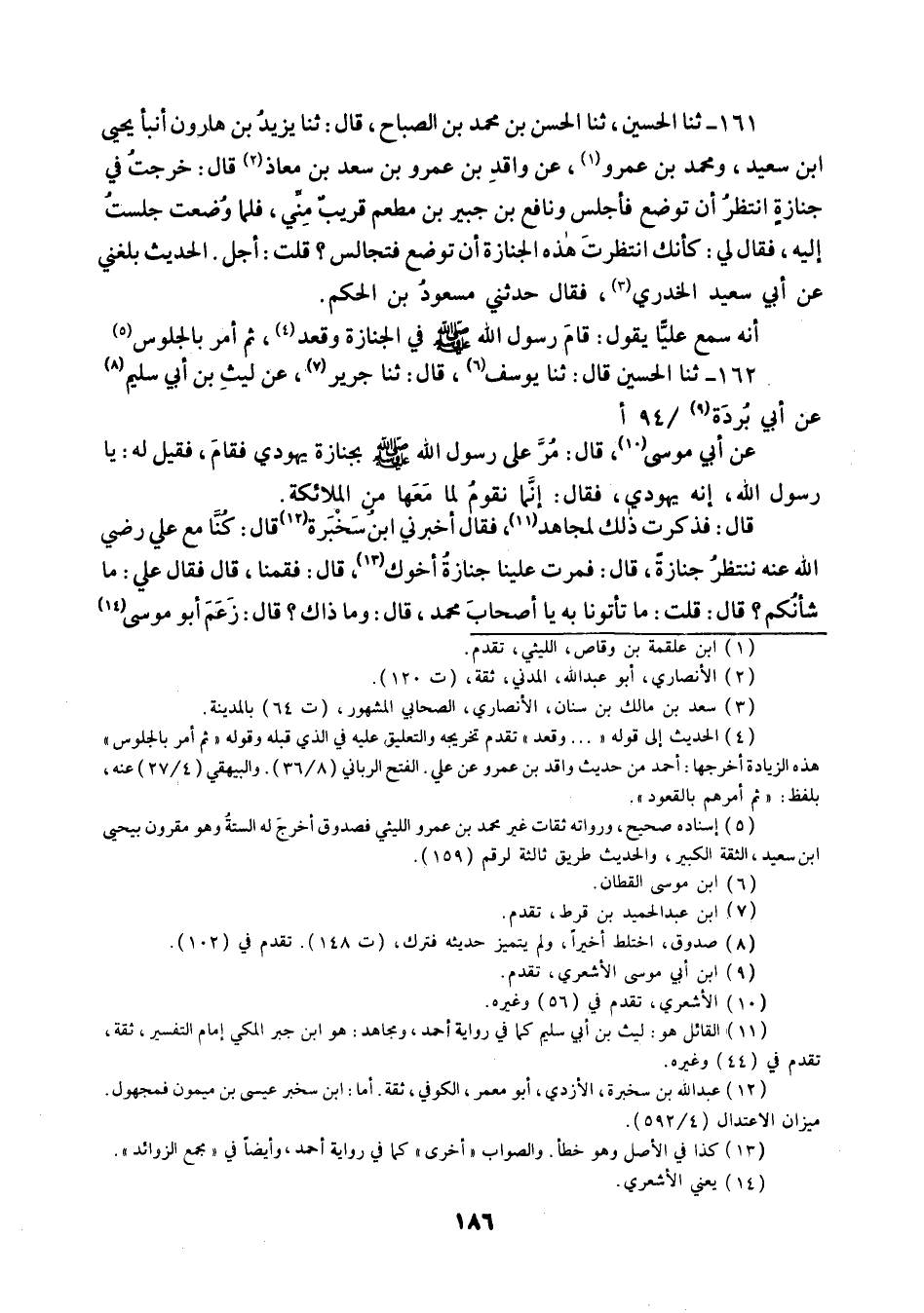 161 - ثنا الْحُسَيْنُ ثنا الْحَسَنُ بْنُ مُحَمَّدِ بْنِ الصَّبَّاحِ قَالَ: ثنا يَزِيدُ بْنُ هَارُونَ، أَنْبَأَ يَحْيَى بْنُ سَعِيدٍ، وَمُحَمَّدُ بْنُ عَمْرٍو، عَنْ وَاقِدِ بْنِ عَمْرِو بْنِ سَعْدِ بْنِ مُعَاذٍ قَالَ: خَرَجْتُ فِي جِنَازَةٍ انْتَظِرُ أَنْ تُوضَعَ فَأَجْلِسُ , وَنَافِعُ بْنُ جُبَيْرِ بْنِ مُطْعِمٍ قَرِيبٌ مِنِّي , فَلَمَّا وُضِعَتْ جَلَسْتُ إِلَيْهِ , فَقَالَ لِي: كَأَنَّكَ انْتَظَرْتَ هَذِهِ الْجِنَازَةَ أَنْ تُوضَعَ فَتُجَالِسُ؟ قُلْتُ: أَجَلْ , الْحَدِيثُ بَلَغَنِي عَنْ أَبِي سَعِيدٍ الْخُدْرِيِّ , فَقَالَ: حَدَّثَنِي مَسْعُودُ بْنُ الْحَكَمِ أَنَّهُ سَمِعَ عَلِيًّا يَقُولُ: «§قَامَ رَسُولُ اللَّهِ صَلَّى اللهُ عَلَيْهِ وَسَلَّمَ فِي الْجِنَازَةِ , وَقَعَدَ , ثُمَّ أَمَرَ بِالْجُلُوسِ»
