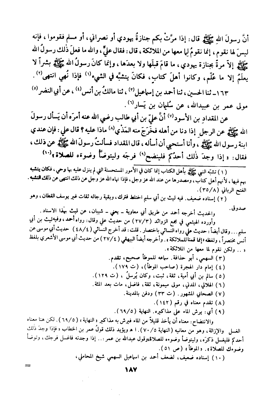 163 - ثنا الْحُسَيْنُ ثنا أَحْمَدُ بْنُ إِسْمَاعِيلَ، ثنا مَالِكُ بْنُ أَنَسٍ، عَنْ أَبِي النَّضْرِ مَوْلَى عُمَرَ بْنِ عُبَيْدِ اللَّهِ , عَنْ سُلَيْمَانَ بْنِ يَسَارٍ، عَنِ الْمِقْدَادِ بْنِ الْأَسْوَدِ، أَنَّ عَلِيَّ بْنَ أَبِي طَالِبٍ رَضِيَ اللَّهُ عَنْهُ أَمَرَهُ أَنْ يَسْأَلَ رَسُولَ اللَّهِ صَلَّى اللهُ عَلَيْهِ وَسَلَّمَ عَنِ الرَّجُلِ إِذَا دَنَا مِنْ أَهْلِهِ , فَخَرَجَ مِنْهُ الْمَذْي مَاذَا عَلَيْهِ؟ قَالَ عَلِيُّ: إِنَّ عِنْدِي ابْنَةَ رَسُولِ اللَّهِ صَلَّى اللهُ عَلَيْهِ وَسَلَّمَ , وَأَنَا أَسْتَحِي أَنْ أَسْأَلَهُ قَالَ الْمِقْدَادُ: فَسَأَلْتُ رَسُولَ اللَّهِ صَلَّى اللهُ عَلَيْهِ وَسَلَّمَ عَنْ ذَلِكَ , فَقَالَ: «§إِذَا وَجَدَ ذَلِكَ أَحَدُكُمْ , فَلْيَنْضَحْ فَرْجَهُ , وَلْيَتَوَضَّأْ وُضُوءَهُ لِلصَّلَاةِ»
