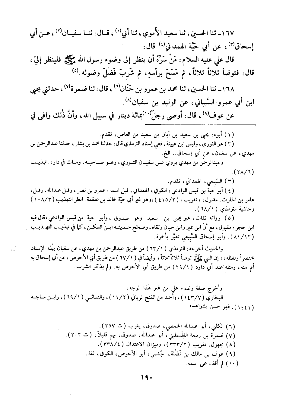 167 - ثنا الْحُسَيْنُ ثنا سَعِيدٌ الْأُمَوِيُّ، ثنا أَبِي قَالَ: ثنا سُفْيَانُ، عَنْ أَبِي إِسْحَاقَ، عَنْ أَبِي حَيَّةَ الْهَمْدَانِيِّ قَالَ: قَالَ عَلِيٌّ عَلَيْهِ السَّلَامُ: " §مَنْ سَرَّهُ أَنْ يَنْظُرَ إِلَى وُضُوءِ رَسُولِ اللَّهِ صَلَّى اللهُ عَلَيْهِ وَسَلَّمَ فَلْيَنْظُرْ إِلَيَّ قَالَ: فَتَوَضَّأَ ثَلَاثًا ثَلَاثًا , ثُمَّ مَسَحَ بِرَأْسِهِ , ثُمَّ شَرِبَ فَضْلَ وَضُوئِهِ "