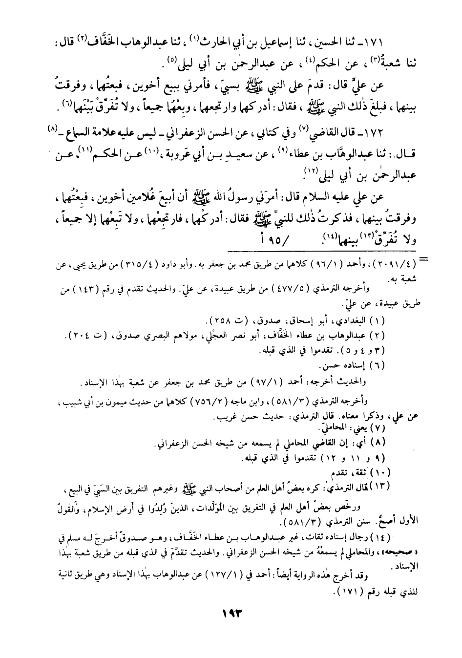 171 - ثنا الْحُسَيْنُ ثنا إِسْمَاعِيلُ بْنُ أَبِي الْحَارِثِ، ثنا عَبْدُ الْوَهَّابِ الْخَفَّافُ قَالَ: ثنا شُعْبَةُ، عَنِ الْحَكَمِ، عَنْ عَبْدِ الرَّحْمَنِ بْنِ أَبِي لَيْلَى , عَنْ عَلِيٍّ قَالَ: قُدِمَ عَلَى النَّبِيِّ صَلَّى اللهُ عَلَيْهِ وَسَلَّمَ بِسَبْيٍ , فَأَمَرَنِي بِبَيْعِ أَخَوَيْنِ , فَبِعْتُهُمَا , وَفَرَّقْتُ بَيْنَهُمَا , فَبَلَغَ ذَلِكَ النَّبِيَّ صَلَّى اللهُ عَلَيْهِ وَسَلَّمَ , فَقَالَ: «§أَدْرِكْهُمَا , وَارْتَجِعْهُمَا وَبِعْهُمَا جَمِيعًا , وَلَا تُفَرِّقْ بَيْنَهُمَا»