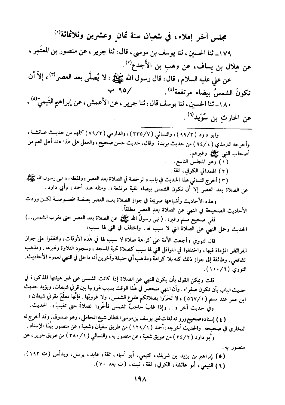 179 - ثنا الْحُسَيْنُ ثنا يُوسُفُ بْنُ مُوسَى قَالَ: ثنا جَرِيرٌ، عَنْ مَنْصُورِ بْنِ الْمُعْتَمِرِ، عَنْ هِلَالِ بْنِ يَسَافٍ، عَنْ وَهْبِ بْنِ الْأَجْدَعِ، عَنْ عَلِيٍّ عَلَيْهِ السَّلَامُ قَالَ: قَالَ رَسُولُ اللَّهِ صَلَّى اللهُ عَلَيْهِ وَسَلَّمَ: «§لَا يُصَلَّى بَعْدَ الْعَصْرِ إِلَّا أَنْ تَكُونَ الشَّمْسُ بَيْضَاءَ مُرْتَفِعَةً»