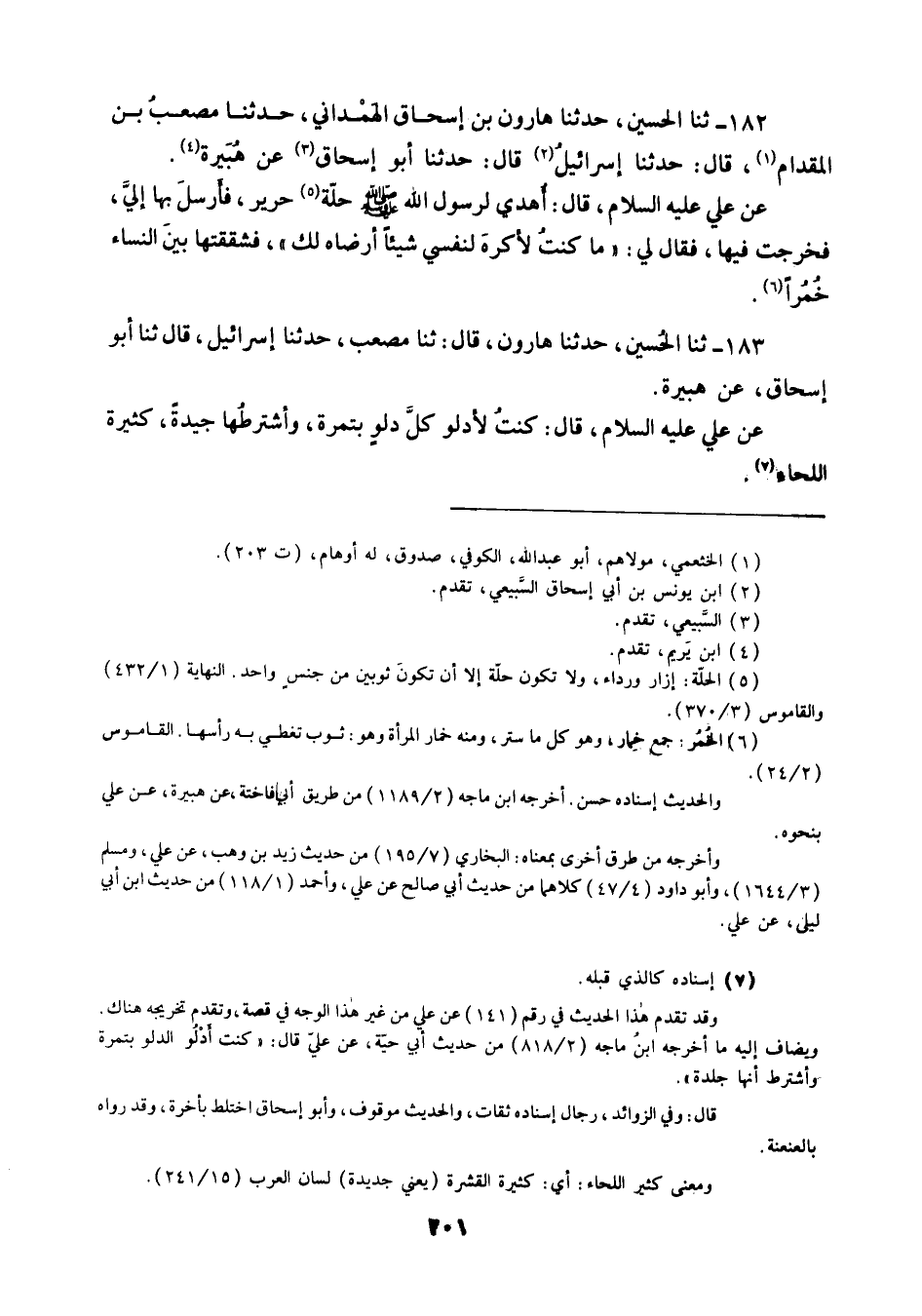 182 - ثنا الْحُسَيْنُ حَدَّثَنَا هَارُونُ بْنُ إِسْحَاقَ الْهَمْدَانِيُّ، حَدَّثَنَا مُصْعَبُ بْنُ الْمِقْدَامِ قَالَ: حَدَّثَنَا إِسْرَائِيلُ قَالَ: حَدَّثَنَا أَبُو إِسْحَاقَ، عَنْ هُبَيْرَةَ، عَنْ عَلِيٍّ عَلَيْهِ السَّلَامُ قَالَ: أُهْدِيَ لِرَسُولِ صَلَّى اللهُ عَلَيْهِ وَسَلَّمَ حُلَّةُ حَرِيرٍ , فَأَرْسَلَ بِهَا إِلَيَّ , فَخَرَجْتُ فِيهَا , فَقَالَ لِي: «§مَا كُنْتُ لِأَكْرَهَ لِنَفْسِي شَيْئًا أَرْضَاهُ لَكَ , فَشَقَقْتُهَا بَيْنَ النِّسَاءِ خُمُرًا»