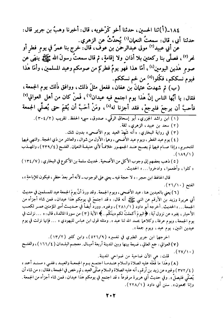 ثنا الْحُسَيْنُ حَدَّثَنَا أَخُو كَرْخَوَيْهِ قَالَ: أَخْبَرَنَا وَهْبُ بْنُ جَرِيرٍ قَالَ: حَدَّثَنَا أَبِي قَالَ: سَمِعْتُ النُّعْمَانَ، يُحَدِّثُ عَنِ الزُّهْرِيِّ، عَنْ أَبِي عُبَيْدٍ مَوْلَى عَبْدِ الرَّحْمَنِ بْنِ عَوْفٍ قَالَ: خَرَجَ بِنَا عُمَرُ فِي يَوْمَ فِطْرٍ أَوْ نَحْرٍ , فَصَلَّى بِنَا رَكْعَتَيْنِ بِلَا أَذَانٍ , وَلَا إِقَامَةٍ , ثُمَّ قَالَ: سَمِعْتُ رَسُولَ اللَّهِ صَلَّى اللهُ عَلَيْهِ وَسَلَّمَ «§يَنْهَى عَنْ صَوْمِ هَذَيْنِ الْيَوْمَيْنِ أَمَّا هَذَا فَهُوَ يَوْمُ فِطْرِكُمْ مِنْ صَوْمِكُمْ , وَعِيدُ الْمُسْلِمِينَ , وَأَمَّا هَذَا فَيَوْمُ نُسُكِكُمْ؛ فَكُلُوا مِنْ لَحْمِ نُسُكِكُمْ» ثُمَّ شَهِدْتُ عُثْمَانَ بْنَ عَفَّانَ , فَفَعَلَ مِثْلَ ذَلِكَ , وَوَافَقَ ذَلِكَ يَوْمَ الْجُمُعَةِ , فَقَالَ: يَا أَيُّهَا النَّاسُ , إِنَّ هَذَا يَوْمٌ اجْتَمَعَ فِيهِ عِيدَانِ , فَمَنْ كَانَ مِنْ أَهْلِ الْعَوَالِي فَأَحَبَّ أَنْ يَرْجِعَ فَلْيَرْجِعْ , فَقَدْ أَجَزْنَا لَهُ , وَمَنْ أَحَبَّ أَنْ يُقِيمَ حَتَّى يُصَلِّيَ الْجُمُعَةَ -[203]- فَلْيَفْعَلْ