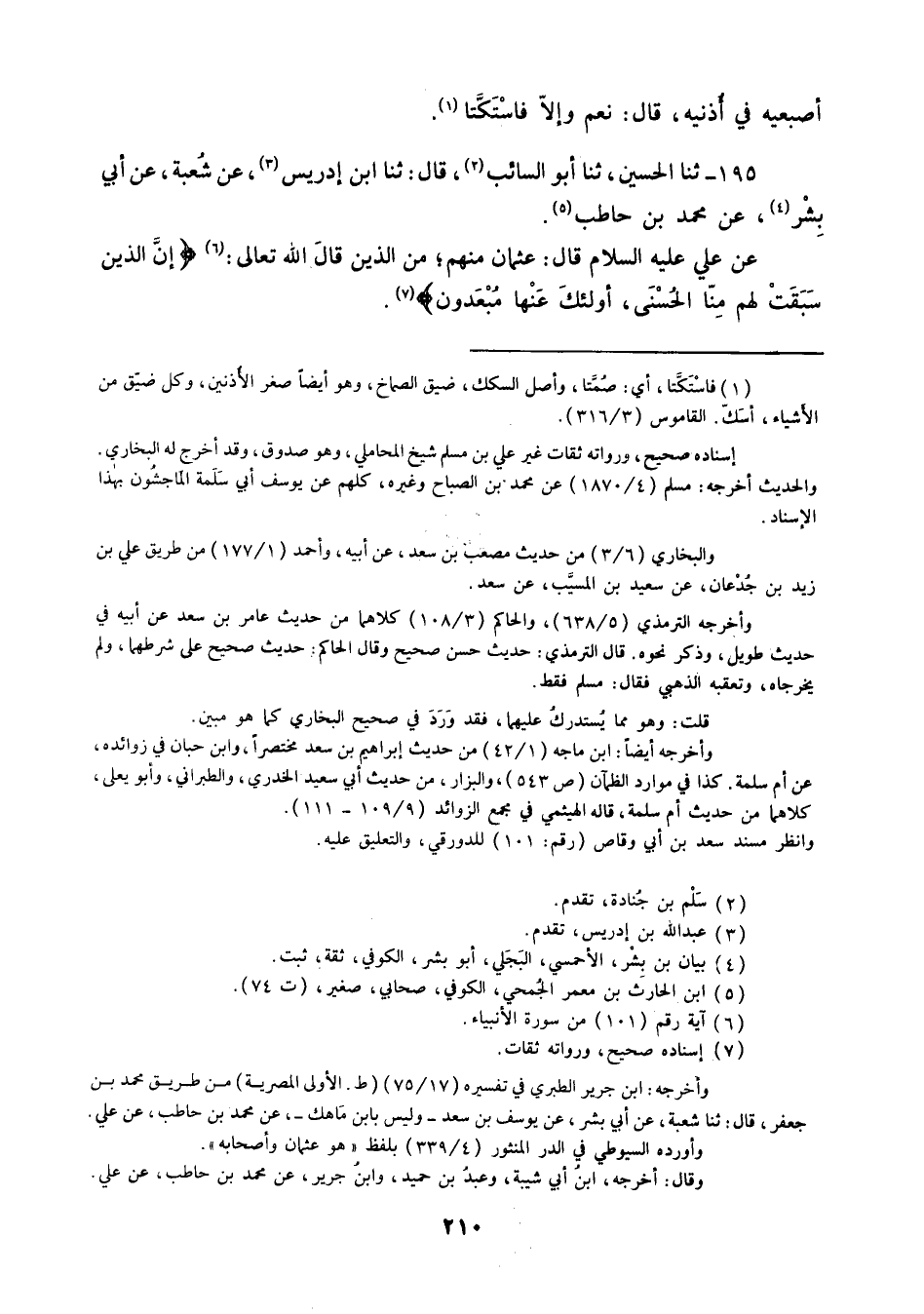195 - ثنا الْحُسَيْنُ ثنا أَبُو السَّائِبِ قَالَ: ثنا ابْنُ إِدْرِيسَ، عَنْ شُعْبَةَ، عَنْ أَبِي بِشْرٍ، عَنْ مُحَمَّدِ بْنِ حَاطِبٍ، عَنْ عَلِيٍّ عَلَيْهِ السَّلَامُ قَالَ: " §عُثْمَانُ مِنْهُمْ: مِنَ الَّذِينَ قَالَ اللَّهُ تَعَالَى: {إِنَّ الَّذِينَ سَبَقَتْ لَهُمْ مِنَّا الْحُسْنَى أُولَئِكَ عَنْهَا مُبْعَدُونَ} [الأنبياء: 101] "