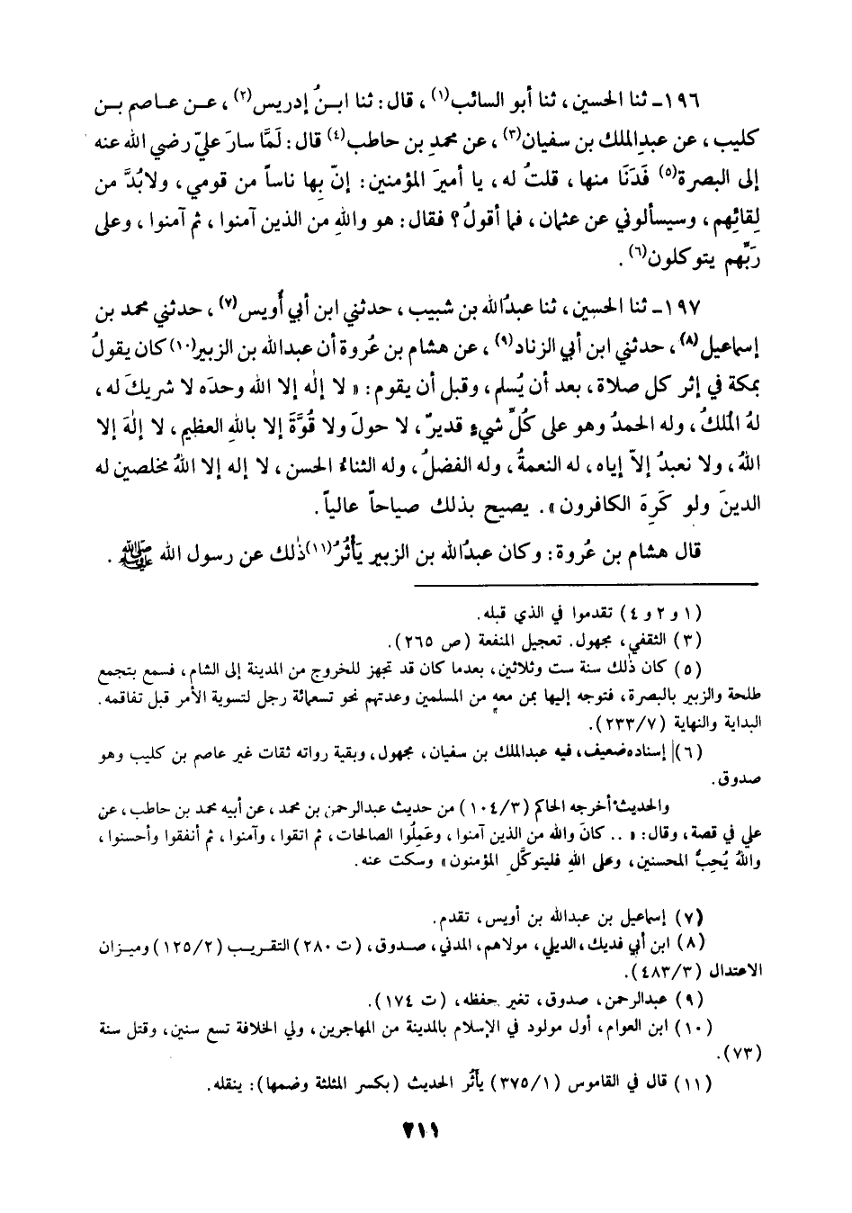 197 - ثنا الْحُسَيْنُ ثنا الْحُسَيْنُ ثنا عَبْدُ اللَّهِ بْنُ شَبِيبٍ، حَدَّثَنِي ابْنُ أَبِي أُوَيْسٍ، حَدَّثَنِي مُحَمَّدُ بْنُ إِسْمَاعِيلَ، حَدَّثَنِي ابْنُ أَبِي الزِّنَادِ، عَنْ هِشَامِ بْنِ عُرْوَةَ، أَنَّ عَبْدَ اللَّهِ بْنَ الزُّبَيْرِ، كَانَ يَقُولُ بِمَكَّةَ فِي أَثَرِ كُلِّ صَلَاةٍ بَعْدَ أَنْ يُسَلِّمَ وَقَبْلَ أَنْ يَقُومَ: «§لَا إِلَهَ إِلَّا اللَّهُ وَحْدَهُ لَا شَرِيكَ لَهُ لَهُ الْمَلِكُ , وَلَهُ الْحَمْدُ , وَهُوَ عَلَى كُلِّ شَيْءٍ قَدِيرٌ لَا حَوْلَ وَلَا قُوَّةَ إِلَّا بِاللَّهِ الْعَظِيمِ لَا إِلَهَ إِلَّا اللَّهُ , وَلَا نَعْبُدُ إِلَّا إِيَّاهُ لَهُ النِّعْمَةُ , وَلَهُ الْفَضْلُ , وَلَهُ الثَّنَاءُ الْحَسَنُ لَا إِلَهَ إِلَّا اللَّهُ مُخْلِصِينَ لَهُ الدِّينُ وَلَوْ كَرِهَ الْكَافِرُونَ». يَصِيحُ بِذَلِكَ صِيَاحًا عَالِيًا " قَالَ هِشَامُ بْنُ عُرْوَةَ: وَكَانَ عَبْدُ اللَّهِ بْنُ الزُّبَيْرِ يَأْثُرُ ذَلِكَ عَنْ رَسُولِ اللَّهِ صَلَّى اللهُ عَلَيْهِ وَسَلَّمَ -[212]-. قَالَ هِشَامٌ: وَكَانَ أَبِي إِذَا صَلَّى الْمَكْتُوبَةَ تَنَحَّى عَنْ مُصَلَّاهُ , فَسَبَّحَ