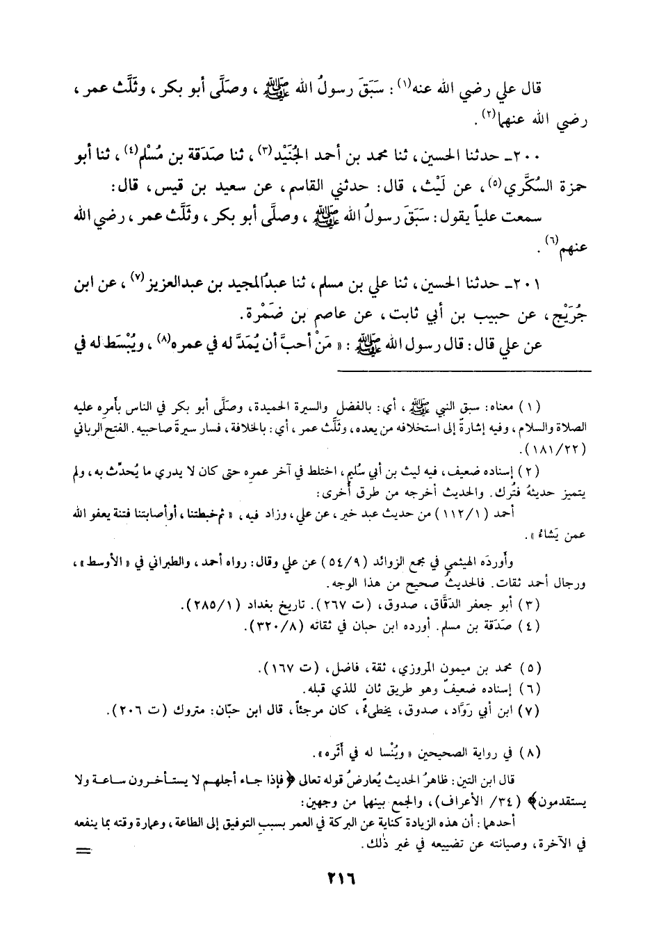 201 - حَدَّثَنَا الْحُسَيْنُ ثنا عَلِيُّ بْنُ مُسْلِمٍ، ثنا عَبْدُ الْمَجِيدِ بْنُ عَبْدِ الْعَزِيزِ، عَنِ ابْنِ جُرَيْجٍ، عَنْ حَبِيبِ بْنِ أَبِي ثَابِتٍ، عَنْ عَاصِمِ بْنِ ضَمْرَةَ، عَنْ عَلِيٍّ قَالَ: قَالَ رَسُولُ اللَّهِ صَلَّى اللهُ عَلَيْهِ وَسَلَّمَ: «§مَنْ أَحَبَّ أَنْ يُمَدَّ لَهُ فِي عُمْرِهِ وَيُبْسَطُ لَهُ فِي -[217]- رِزْقِهِ , وَيُدْفَعُ عَنْهُ مِيتَةُ السُّوءِ , وَيُسْتَجَابُ دُعَاؤُهُ , فَلْيَتَّقِ اللَّهَ , وَلْيَصِلْ رَحِمَهُ»