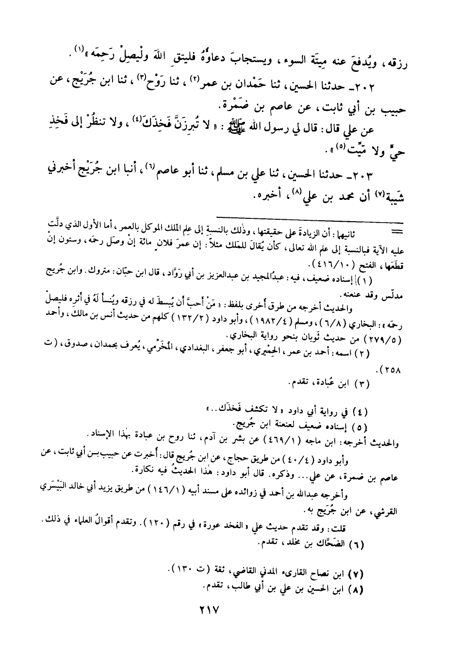 202 - حَدَّثَنَا الْحُسَيْنُ ثنا حَمْدَانَ بْنُ عُمَرَ، ثنا رَوْحٌ، ثنا ابْنُ جُرَيْجٍ، عَنْ حَبِيبِ بْنِ أَبِي ثَابِتٍ، عَنْ عَاصِمِ بْنِ ضَمْرَةَ، عَنْ عَلِيٍّ قَالَ: قَالَ لِي رَسُولُ اللَّهِ صَلَّى اللهُ عَلَيْهِ وَسَلَّمَ: «§لَا تُبْرِزَنَّ فَخِذَكَ , وَلَا تَنْظُرْ إِلَى فَخِذِ حَيٍّ وَلَا مَيِّتٍ»