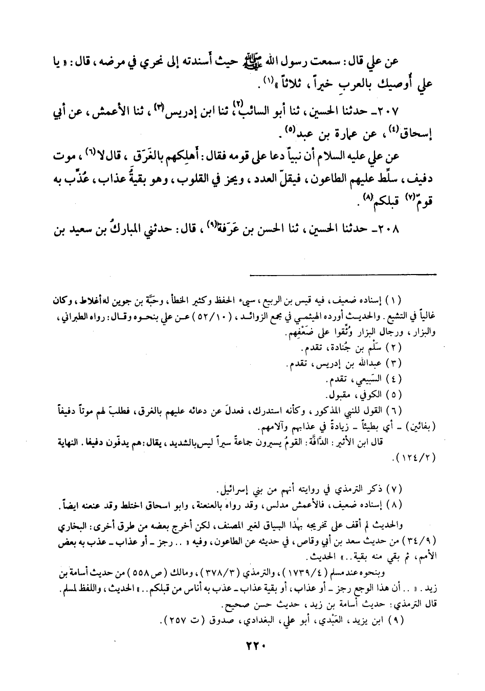 207 - حَدَّثَنَا الْحُسَيْنُ ثنا أَبُو السَّائِبِ، ثنا ابْنُ إِدْرِيسَ، ثنا الْأَعْمَشُ، عَنْ أَبِي إِسْحَاقَ، عَنْ عُمَارَةَ بْنِ عَبْدٍ، عَنْ عَلِيٍّ عَلَيْهِ السَّلَامُ: " أَنَّ نَبِيًّا دَعَا عَلَى قَوْمِهِ , فَقَالَ: §أَهْلِكْهُمْ بِالْغَرَقِ قَالَ: لَا , مَوْتٌ دَفِيفٌ , سَلِّطْ عَلَيْهِمُ الطَّاعُونَ , فَيَقِلَّ الْعَدَدُ , وَيَحِزَّ فِي الْقُلُوبِ «, وَهُوَ بَقِيَّةُ عَذَابٍ عُذِّبَ بِهِ قَوْمٌ قَبْلَكُمْ»