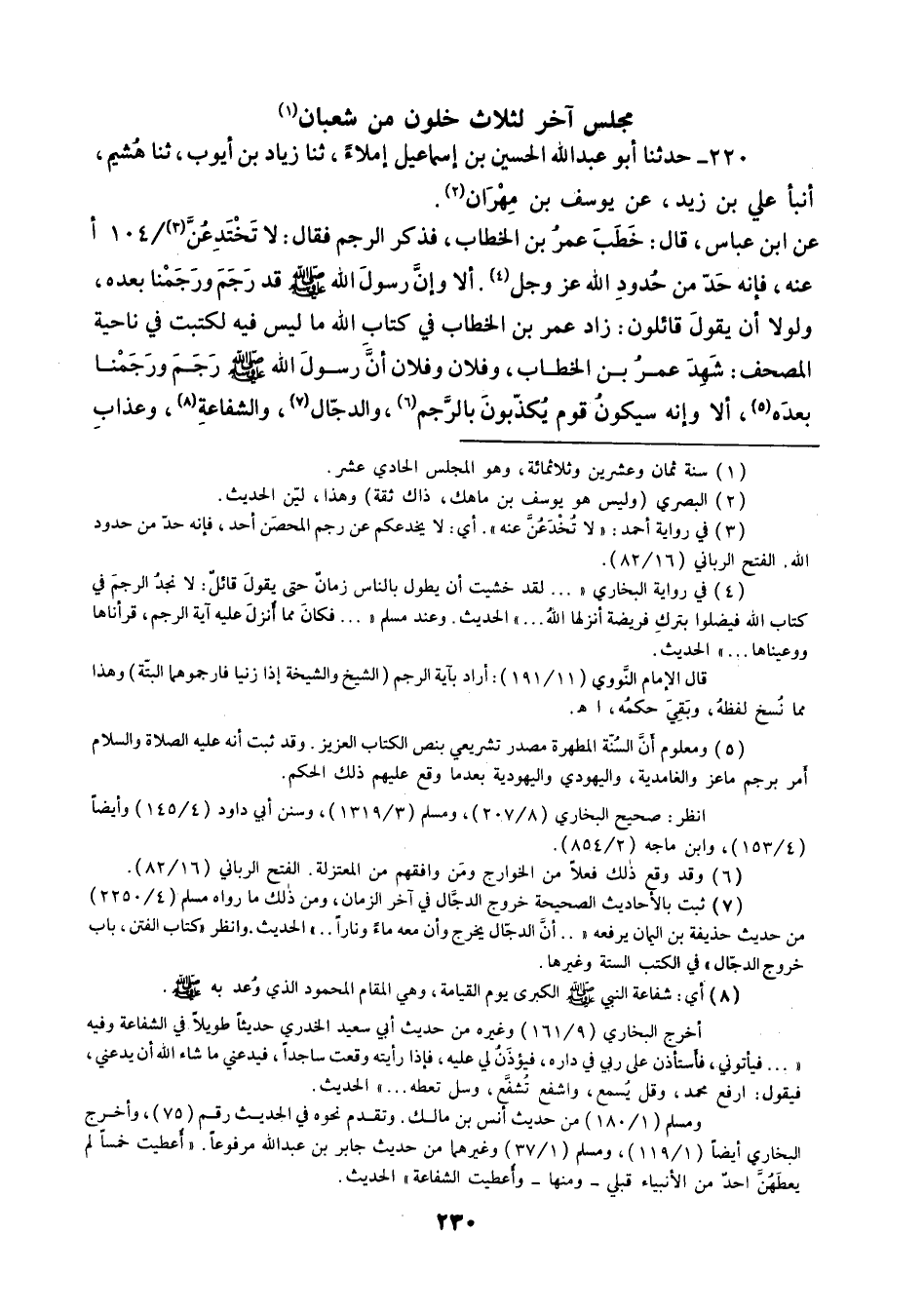 220 - حَدَّثَنَا أَبُو عَبْدِ اللَّهِ الْحُسَيْنُ بْنِ إِسْمَاعِيلَ إِمَلَاءً ثنا زِيَادُ بْنُ أَيُّوبَ، ثنا هُشَيْمٌ، أَنْبَأَ عَلِيُّ بْنُ زَيْدٍ , عَنْ يُوسُفَ بْنِ مِهْرَانَ، عَنِ ابْنِ عَبَّاسٍ قَالَ: خَطَبَ عُمَرُ بْنُ الْخَطَّابِ , فَذَكَرَ الرَّجْمَ , فَقَالَ: " لَا تَخْتَدِعُنَّ عَنْهُ فَإِنَّهُ حَدٌّ مِنْ حُدُودِ اللَّهِ عَزَّ وَجَلَّ أَلَا وَإِنَّ رَسُولَ اللَّهِ صَلَّى اللهُ عَلَيْهِ وَسَلَّمَ قَدْ §رَجَمَ وَرَجَمْنَا بَعْدَهُ , وَلَوْلَا أَنْ يَقُولَ قَائِلُونَ: زَادَ عُمَرُ بْنُ الْخَطَّابِ فِي كِتَابِ اللَّهِ مَا لَيْسَ فِيهِ لَكَتَبْتُ فِي نَاحِيَةِ الْمُصْحَفِ: شَهِدَ عُمَرُ بْنُ الْخَطَّابِ وَفُلَانٌ وَفُلَانٌ أَنَّ رَسُولَ اللَّهِ صَلَّى اللهُ عَلَيْهِ وَسَلَّمَ رَجَمَ وَرَجَمْنَا بَعْدَهُ أَلَا وَإِنَّهُ سَيَكُونُ قَوْمٌ يُكَذِّبُونَ بِالرَّجْمِ , وَالدَّجَّالِ , وَالشَّفَاعَةِ , وَعَذَابِ -[231]- الْقَبْرِ , وَبِقَوْمٍ يَخْرُجُونَ مِنَ النَّارِ بَعْدَمَا امْتُحِشُوا "