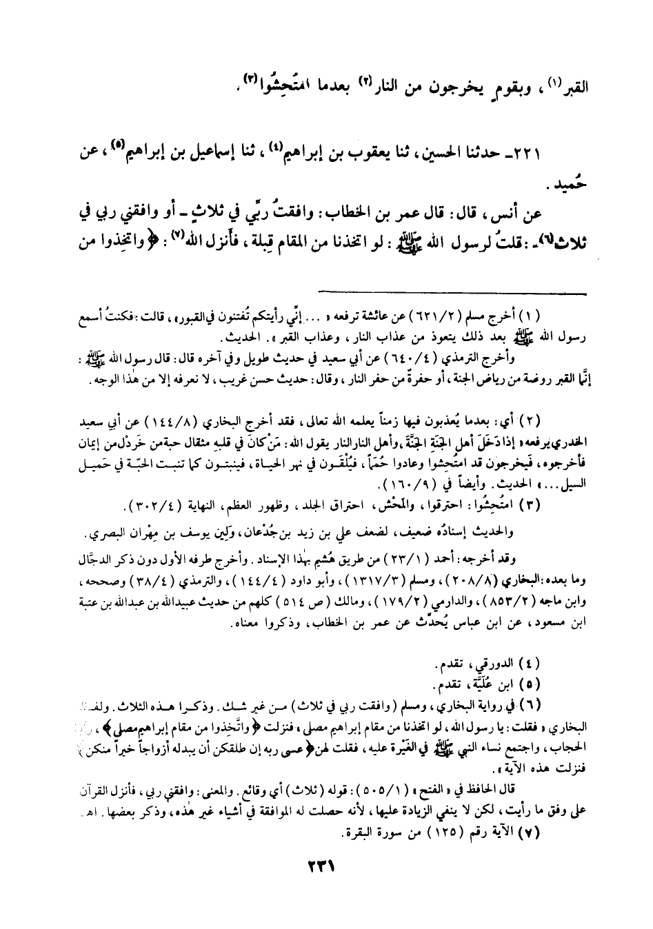 221 - حَدَّثَنَا الْحُسَيْنُ ثنا يَعْقُوبُ بْنُ إِبْرَاهِيمَ، ثنا إِسْمَاعِيلُ بْنُ إِبْرَاهِيمَ، عَنْ حُمَيْدٍ، عَنْ أَنَسٍ قَالَ: قَالَ عُمَرُ بْنُ الْخَطَّابِ: " §وَافَقْتُ رَبِّي فِي ثَلَاثٍ أَوْ وَافَقَنِي رَبِّي فِي ثَلَاثٍ قُلْتُ لِرَسُولِ اللَّهِ صَلَّى اللهُ عَلَيْهِ وَسَلَّمَ: لَوِ اتَّخَذْنَا مِنَ الْمَقَامِ قِبْلَةً , فَانْزَلَ اللَّهُ: {وَاتَّخِذُوا مِنْ مَقَامِ إِبْرَاهِيمَ مُصَلًّى} [البقرة: 125]