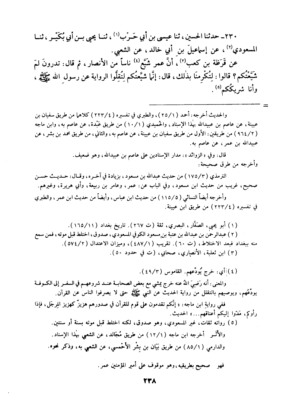 230 - حَدَّثَنَا الْحُسَيْنُ ثنا عِيسَى بْنُ أَبِي حَرْبٍ، ثنا يَحْيَى بْنُ أَبِي بُكَيْرٍ، ثنا الْمَسْعُودِيُّ، عَنْ إِسْمَاعِيلَ بْنِ أَبِي خَالِدٍ، عَنِ الشَّعْبِيِّ، عَنْ قَرَظَةَ بْنِ كَعْبٍ، أَنَّ عُمَرَ: شَيَّعَ نَاسًا مِنَ الْأَنْصَارِ , ثُمَّ قَالَ: «تَدْرُونَ لِمَ شَيَّعْتُكُمْ؟» قَالُوا: لِتُكْرِمَنَا بِذَلِكَ قَالَ: «إِنَّمَا §شَيَّعْتُكُمْ؛ لِتُقِلُّوا الرِّوَايَةَ عَنْ رَسُولِ اللَّهِ صَلَّى اللهُ عَلَيْهِ وَسَلَّمَ , وَأَنَا شَرِيكُكُمْ»