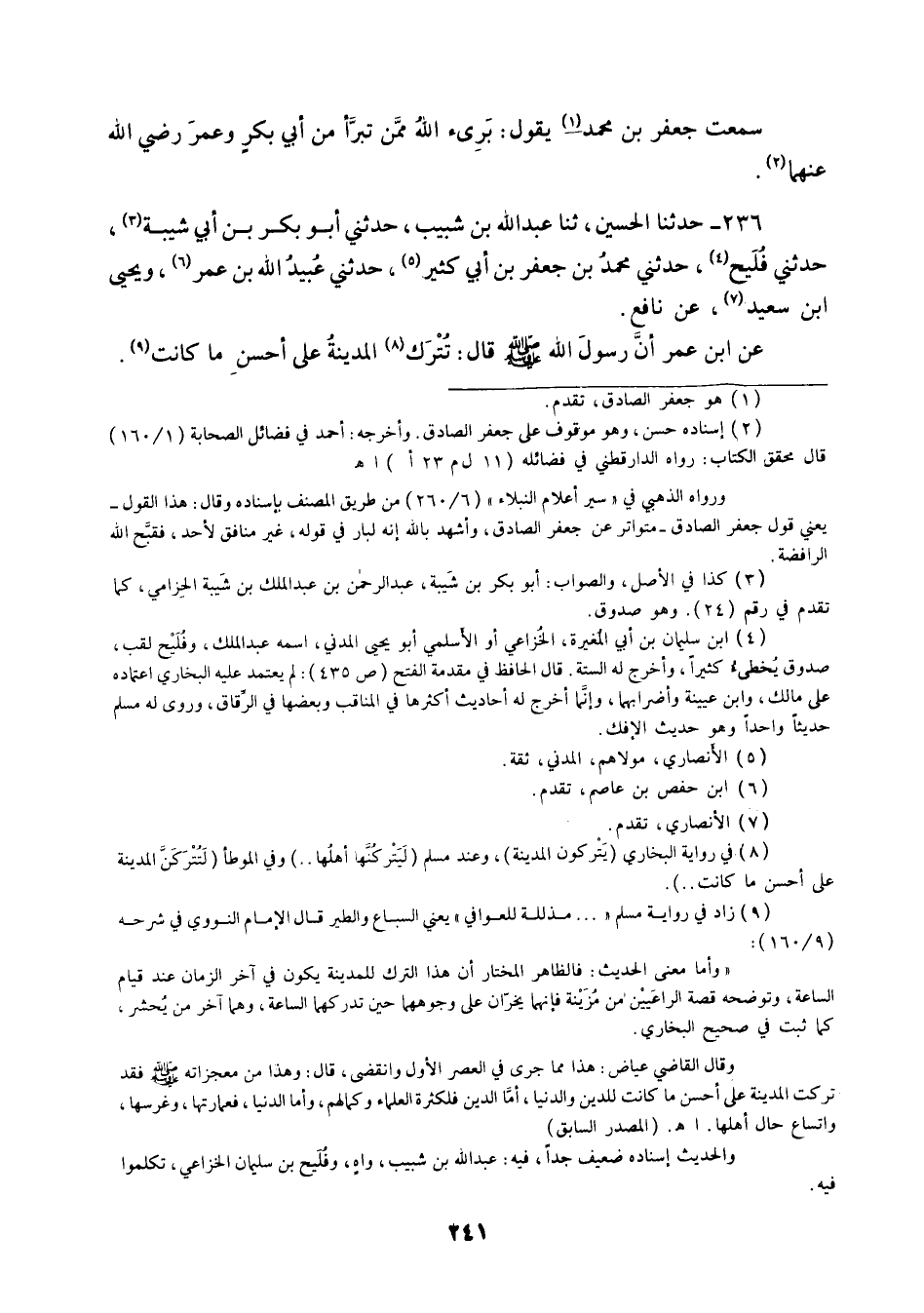 236 - حَدَّثَنَا الْحُسَيْنُ ثنا عَبْدُ اللَّهِ بْنُ شَبِيبٍ، حَدَّثَنِي أَبُو بَكْرِ بْنُ أَبِي شَيْبَةَ، حَدَّثَنِي فُلَيْحٌ، حَدَّثَنِي مُحَمَّدُ بْنُ جَعْفَرِ بْنِ أَبِي كَثِيرٍ، حَدَّثَنِي عُبَيْدُ اللَّهِ بْنُ عُمَرَ، وَيَحْيَى بْنُ سَعِيدٍ، عَنْ نَافِعٍ، عَنِ ابْنِ عُمَرَ أَنَّ رَسُولَ اللَّهِ صَلَّى اللهُ عَلَيْهِ وَسَلَّمَ قَالَ: «§تُتْرَكُ الْمَدِينَةُ عَلَى أَحْسَنِ مَا كَانَتْ»