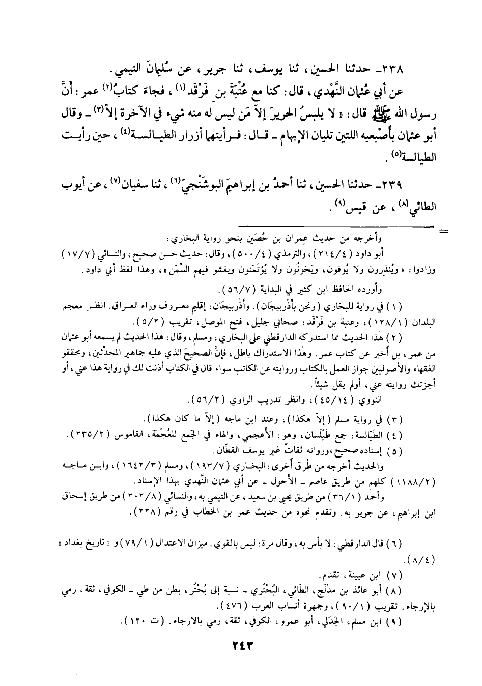 238 - حَدَّثَنَا الْحُسَيْنُ ثنا يُوسُفُ، ثنا جَرِيرٌ، عَنْ سُلَيْمَانَ التَّيْمِيِّ، عَنْ أَبِي عُثْمَانَ النَّهْدِيِّ قَالَ: كُنَّا مَعَ عُتْبَةَ بْنِ فَرْقَدٍ , فَجَاءَ كِتَابُ عُمَرَ أَنَّ رَسُولَ اللَّهِ صَلَّى اللهُ عَلَيْهِ وَسَلَّمَ قَالَ: «§لَا يَلْبَسُ الْحَرِيرَ إِلَّا مَنْ لَيْسَ لَهُ مِنْهُ شَيْءٌ فِي الْآخِرَةِ إِلَّا هَكَذَا» , وَقَالَ أَبُو عُثْمَانَ بِأُصْبُعَيْهِ اللَّتَيْنِ تَلِيَانِ الْإِبْهَامَ , قَالَ فَرَأَيْتُهُمَا أَزْرَارَ الطَّيَالِسَةِ حِينَ رَأَيْتُ الطَّيَالِسَةَ