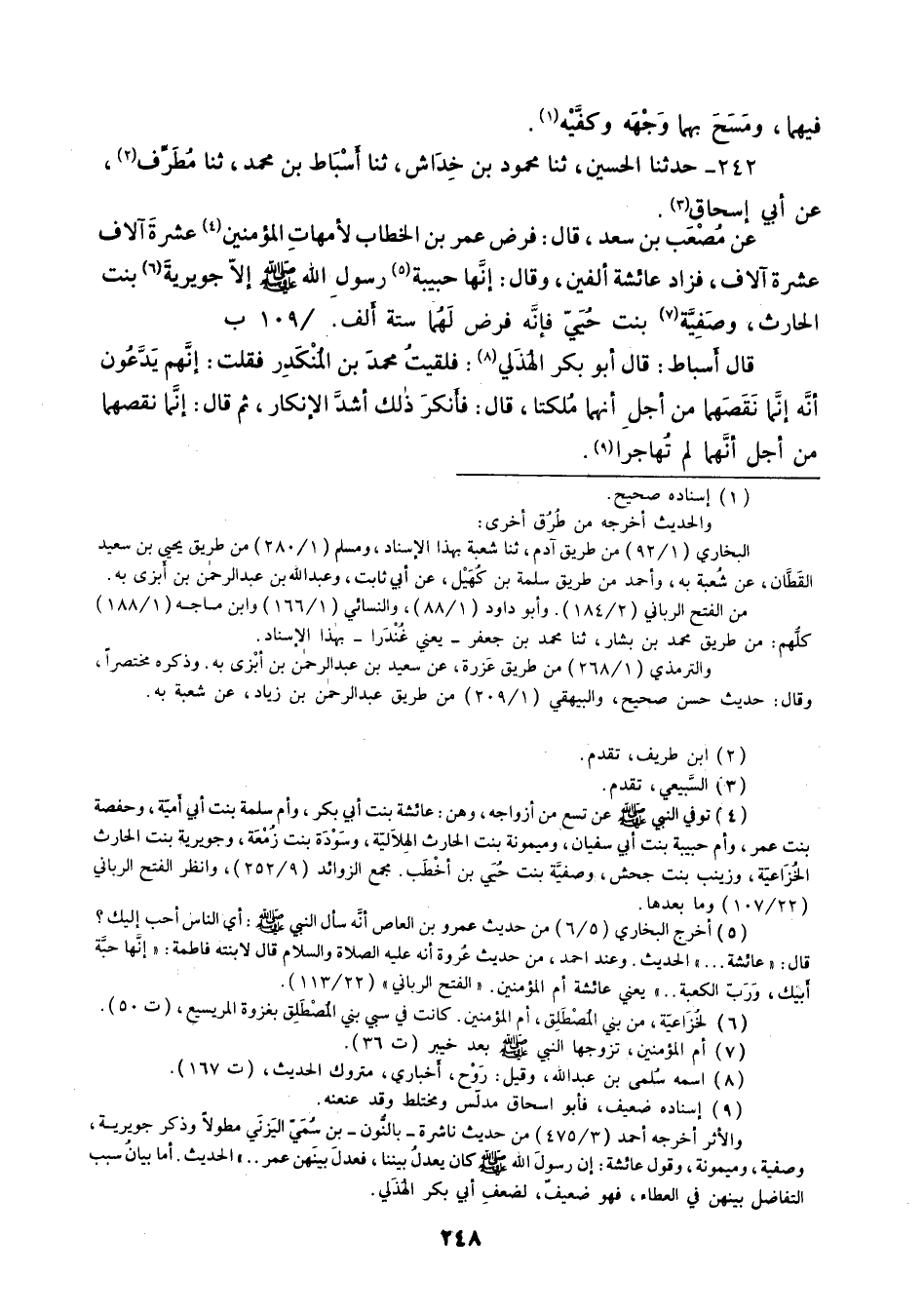 242 - حَدَّثَنَا الْحُسَيْنُ ثنا مَحْمُودُ بْنُ خِدَاشٍ، ثنا أَسْبَاطُ بْنُ مُحَمَّدٍ، ثنا مُطَرِّفٌ، عَنْ أَبِي إِسْحَاقَ، عَنْ مُصْعَبِ بْنِ سَعْدٍ قَالَ: " §فَرَضَ عُمَرُ بْنُ الْخَطَّابِ لِأُمَّهَاتِ الْمُؤْمِنِينَ عَشَرَةَ آلَافٍ عَشَرَةَ آلَافٍ , فَزَادَ عَائِشَةَ أَلْفَيْنِ , وَقَالَ: إِنَّهَا حَبِيبَةُ رَسُولِ اللَّهِ صَلَّى اللهُ عَلَيْهِ وَسَلَّمَ إِلَّا جُوَيْرِيَةَ بِنْتَ الْحَارِثِ , وَصَفِيَّةَ بِنْتَ حُيَيٍّ فَإِنَّهُ فَرَضَ لَهُمَا سِتَّةَ أَلْفٍ " قَالَ أَسْبَاطٌ: قَالَ أَبُو بَكْرٍ الْهُذَلِيُّ: فَلَقِيتُ مُحَمَّدَ بْنَ الْمُنْكَدِرِ , فَقُلْتُ: إِنَّهُمْ يَدَّعُونَ أَنَّهُ إِنَّمَا نَقَصَهُمَا مِنْ أَجْلِ أَنَّهُمَا مُلِكَتَا قَالَ: فَأَنْكَرَ ذَلِكَ أَشَدَّ الْإِنْكَارِ , ثُمَّ قَالَ: إِنَّمَا نَقَصَهُمَا مِنْ أَجْلِ أَنَّهُمَا لَمْ تُهَاجِرَا