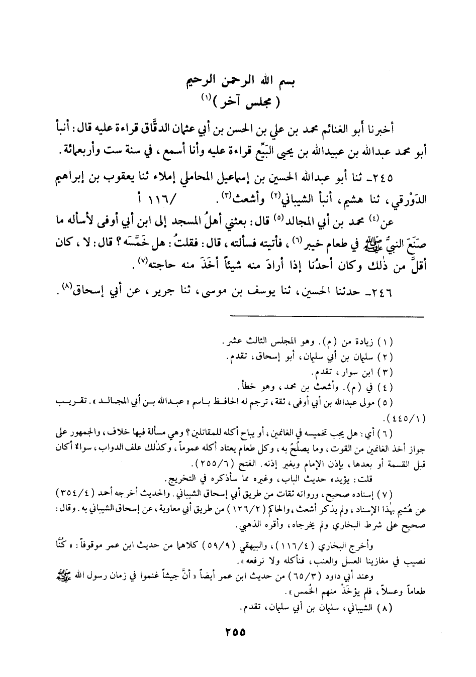 245 - ثنا أَبُو عَبْدِ اللَّهِ الْحُسَيْنُ بْنُ إِسْمَاعِيلَ الْمُحَامِلِيُّ إِمْلَاءً ثنا يَعْقُوبُ بْنُ إِبْرَاهِيمَ الدَّوْرَقِيُّ، ثنا هُشَيْمٌ، أَنْبَأَ الشَّيْبَانِيُّ، وَأَشْعَثُ، عَنْ مُحَمَّدِ بْنِ أَبِي الْمُجَالِدِ قَالَ: بَعَثَنِي أَهْلُ الْمَسْجِدِ إِلَى ابْنِ أَبِي أَوْفَى لِأَسْأَلَهُ: مَا صَنَعَ النَّبِيُّ صَلَّى اللهُ عَلَيْهِ وَسَلَّمَ فِي طَعَامِ خَيْبَرَ؟ فَأَتَيْتُهُ , فَسَأَلْتُهُ قَالَ: فَقُلْتُ: هَلْ خَمَّسَهُ؟ قَالَ: «§لَا كَانَ أَقَلَّ مِنْ ذَلِكَ , وَكَانَ أَحَدُنَا إِذَا أَرَادَ مِنْهُ شَيْئًا أَخَذَ مِنْهُ حَاجَتَهُ»