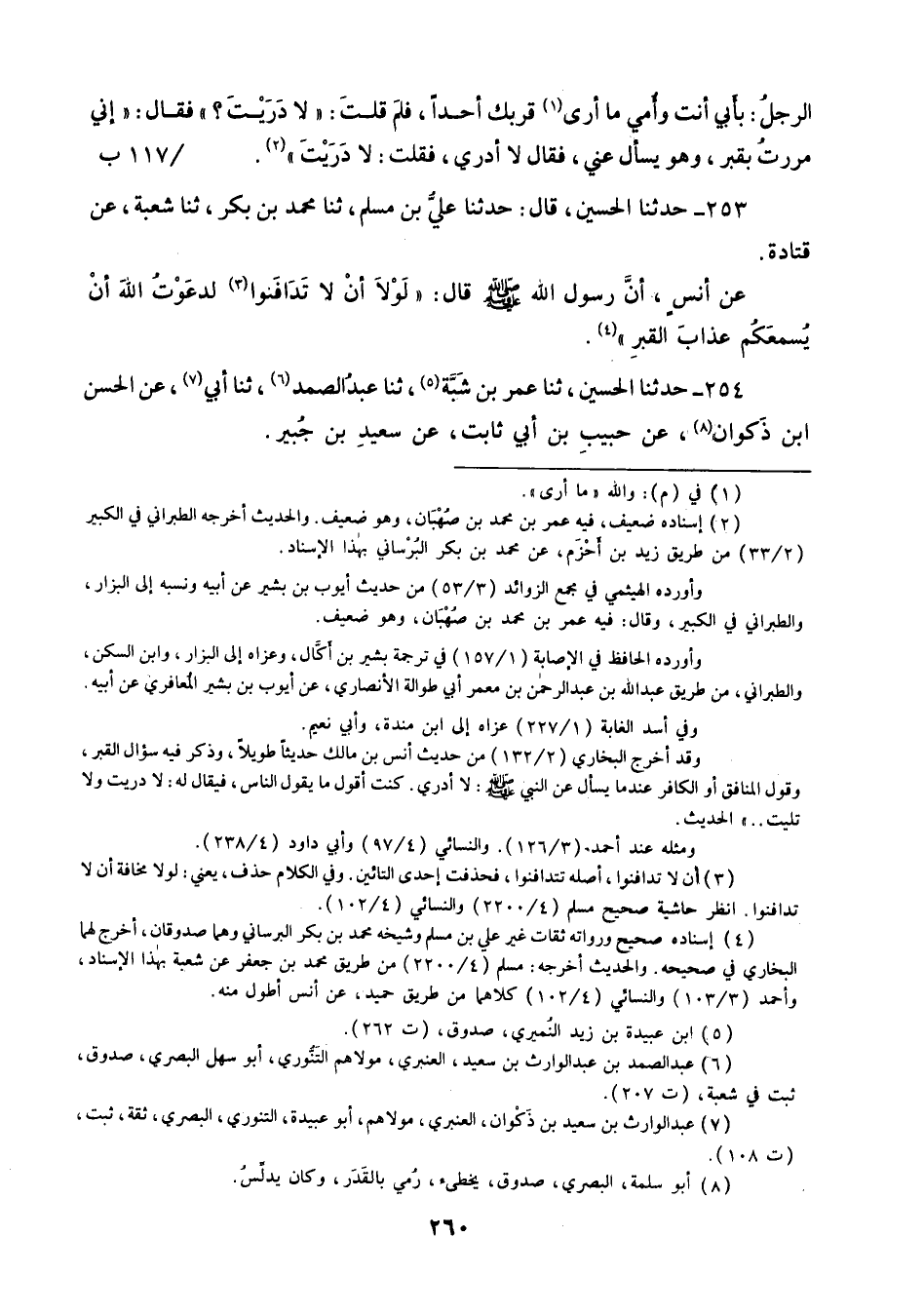 253 - حَدَّثَنَا الْحُسَيْنُ حَدَّثَنَا عَلِيُّ بْنُ مُسْلِمٍ، ثنا مُحَمَّدُ بْنُ بَكْرٍ، ثنا شُعْبَةُ، عَنْ قَتَادَةَ، عَنْ أَنَسٍ أَنَّ رَسُولَ اللَّهِ صَلَّى اللهُ عَلَيْهِ وَسَلَّمَ قَالَ: «§لَوْلَا أَنْ لَا تَدَافَنُوا لَدَعَوْتُ اللَّهَ أَنْ يُسْمِعَكُمْ عَذَابَ الْقَبْرِ»