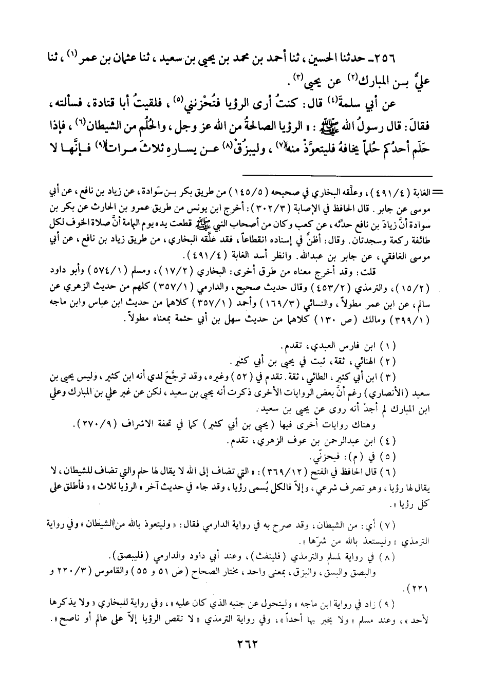 256 - حَدَّثَنَا الْحُسَيْنُ ثنا أَحْمَدُ بْنُ مُحَمَّدِ بْنِ يَحْيَى بْنِ سَعِيدٍ، ثنا عُثْمَانُ بْنُ عُمَرَ، ثنا عَلِيُّ بْنُ الْمُبَارَكِ، عَنْ يَحْيَى، عَنْ أَبِي سَلَمَةَ قَالَ: كُنْتُ أَرَى الرُّؤْيَا , فَتَحْزُنَنِي , فَلَقِيتُ أَبَا قَتَادَةَ , فَسَأَلْتُهُ , فَقَالَ: قَالَ رَسُولُ اللَّهِ صَلَّى اللهُ عَلَيْهِ وَسَلَّمَ: «§الرُّؤْيَا الصَّالِحَةُ مِنَ اللَّهِ عَزَّ وَجَلَّ , وَالْحُلْمُ مِنَ الشَّيْطَانِ , فَإِذَا حَلَمَ أَحَدُكُمْ حُلْمًا يَخَافُهُ فَلْيَتَعَوَّذْ مِنْهُ وَلْيَبْزُقْ عَنْ يَسَارِهِ ثَلَاثَ مَرَّاتٍ؛ فَإِنَّهَا لَا تَضُرُّهُ»