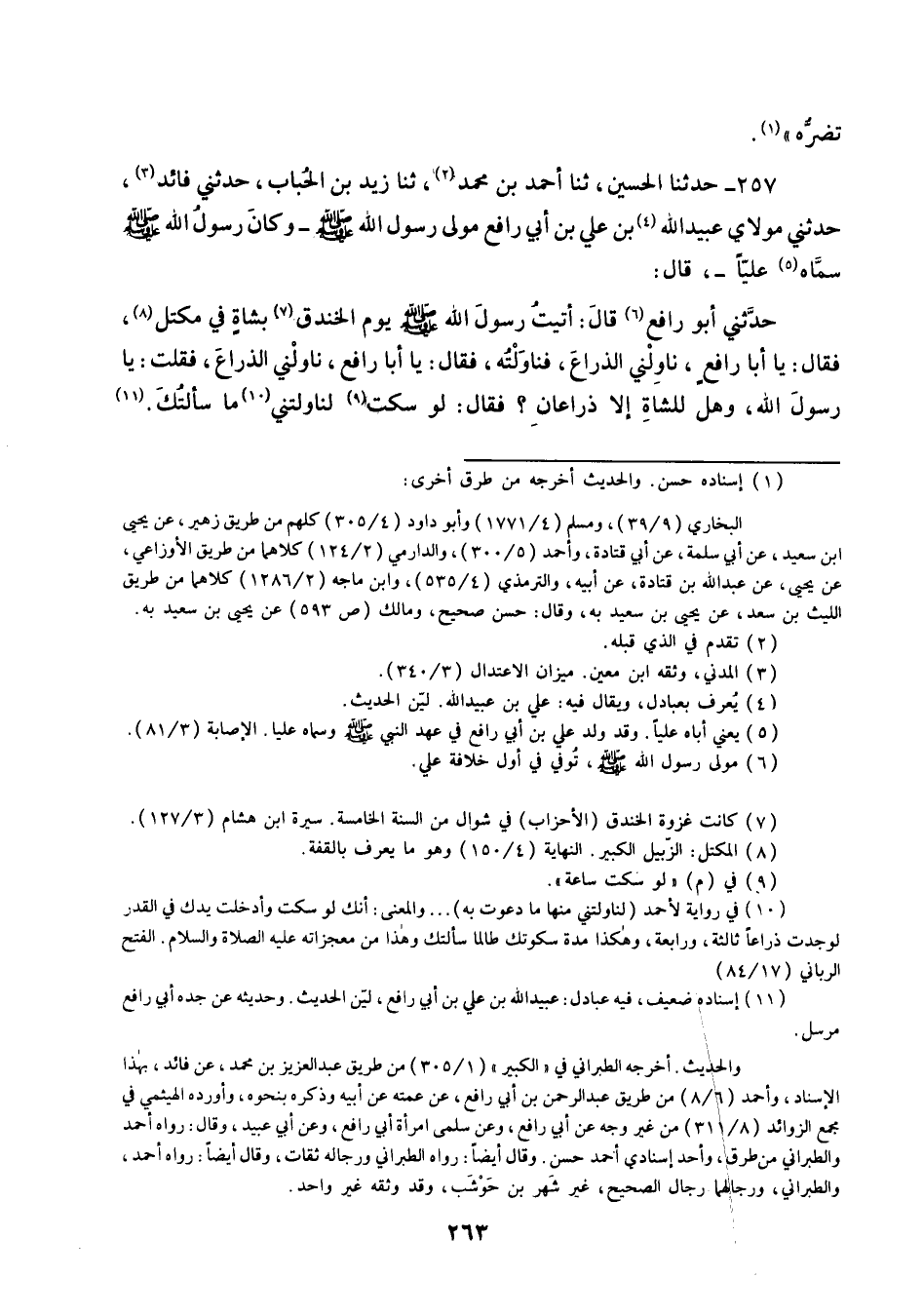257 - حَدَّثَنَا الْحُسَيْنُ ثنا أَحْمَدُ بْنُ مُحَمَّدٍ، ثنا زَيْدُ بْنُ الْحُبَابِ، حَدَّثَنِي فَائِدٌ، حَدَّثَنِي مَوْلَايَ عُبَيْدُ اللَّهِ بْنُ عَلِيِّ بْنِ أَبِي رَافِعٍ مَوْلَى رَسُولِ اللَّهِ صَلَّى اللهُ عَلَيْهِ وَسَلَّمَ , وَكَانَ رَسُولُ اللَّهِ صَلَّى اللهُ عَلَيْهِ وَسَلَّمَ سَمَّاهُ عَلِيًّا قَالَ: حَدَّثَنِي أَبُو رَافِعٍ قَالَ: أَتَيْتُ رَسُولَ اللَّهِ صَلَّى اللهُ عَلَيْهِ وَسَلَّمَ يَوْمَ الْخَنْدَقِ بِشَاةٍ فِي مِكْتَلٍ , فَقَالَ: «يَا أَبَا رَافِعِ , §نَاوِلْنِي الذِّرَاعَ» , فَنَاوَلْتُهُ , فَقَالَ: «يَا أَبَا رَافِعِ نَاوِلْنِي الذِّرَاعَ» , فَقُلْتُ: يَا رَسُولَ اللَّهِ , وَهَلْ لِلشَّاةِ إِلَّا ذِرَاعَانِ , فَقَالَ: «لَوْ سَكَتَّ لَنَاوَلْتَنِي مَا سَأَلْتُكَ»