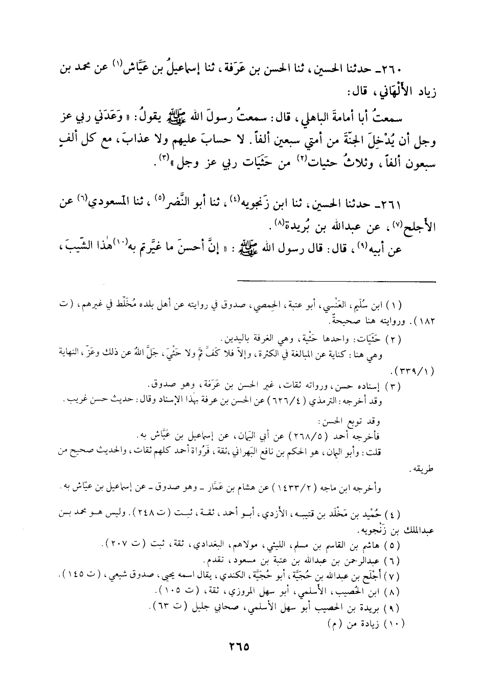260 - حَدَّثَنَا الْحُسَيْنُ ثنا الْحَسَنُ بْنُ عَرَفَةَ، ثنا إِسْمَاعِيلُ بْنُ عَيَّاشٍ، عَنْ مُحَمَّدِ بْنِ زِيَادٍ الْأَلْهَانِيِّ قَالَ: سَمِعْتُ أَبَا أُمَامَةَ الْبَاهِلِيَّ قَالَ: سَمِعْتُ رَسُولَ اللَّهِ صَلَّى اللهُ عَلَيْهِ وَسَلَّمَ يَقُولُ: «§وَعَدَنِي رَبِّي عَزَّ وَجَلَّ أَنْ يُدْخِلَ الْجَنَّةَ مِنْ أُمَّتِي سَبْعِينَ أَلْفًا لَا حِسَابَ عَلَيْهِمْ , وَلَا عَذَابَ مَعَ كُلِّ أَلْفٍ سَبْعُونَ أَلْفًا وَثَلَاثُ حَثَيَاتٍ مِنْ حَثَيَاتِ رَبِّي عَزَّ وَجَلَّ»