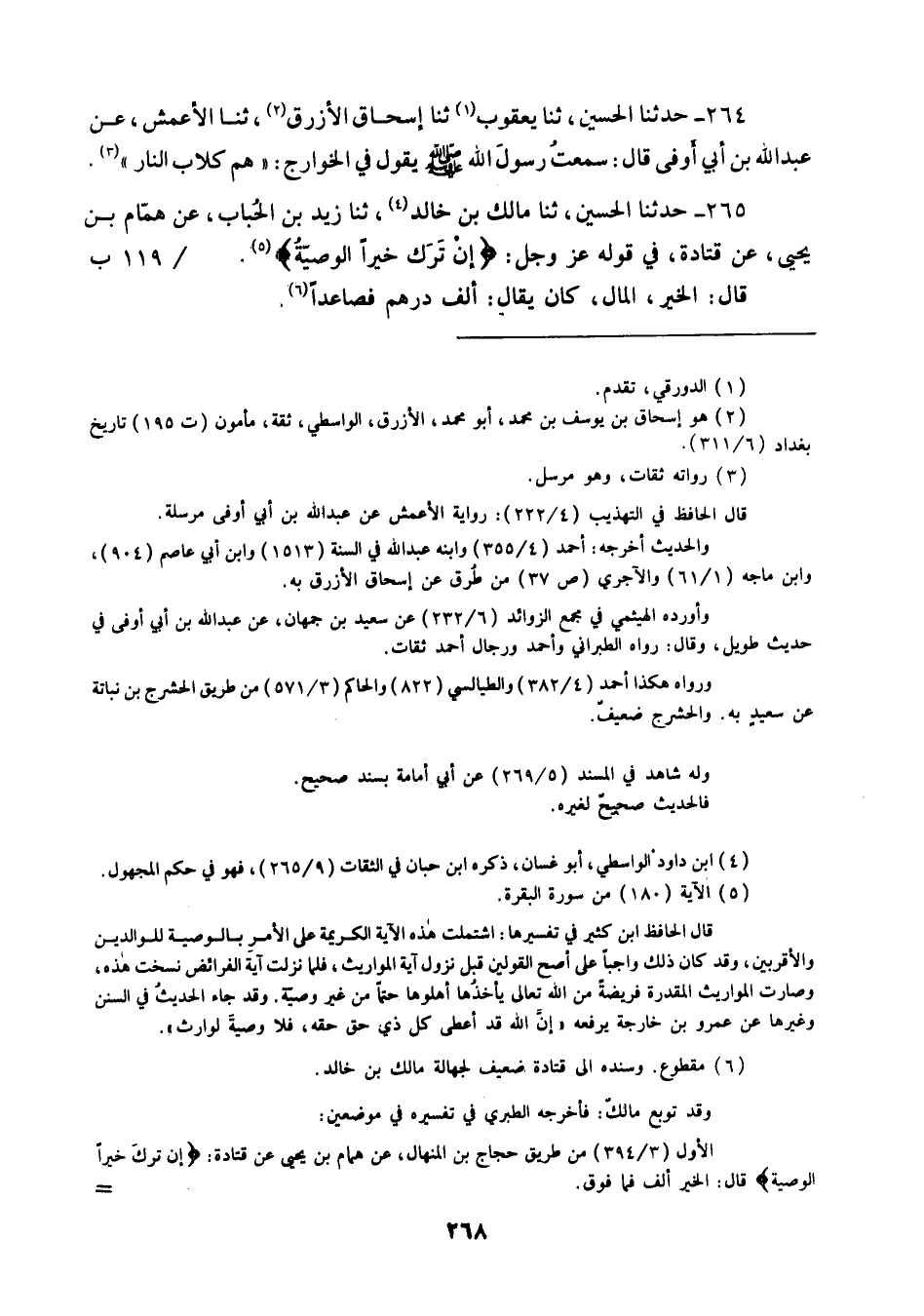265 - حَدَّثَنَا الْحُسَيْنُ ثنا مَالِكُ بْنُ خَالِدٍ، ثنا زَيْدُ بْنُ الْحُبَابِ، عَنْ هَمَّامِ بْنِ يَحْيَى، عَنْ قَتَادَةَ فِي قَوْلِهِ عَزَّ وَجَلَّ: {إِنْ تَرَكَ خَيْرًا الْوَصِيَّةُ} [البقرة: 180] قَالَ: " §الْخَيْرُ , الْمَالُ كَانَ يُقَالُ: أَلْفُ دِرْهَمٍ فَصَاعِدًا "