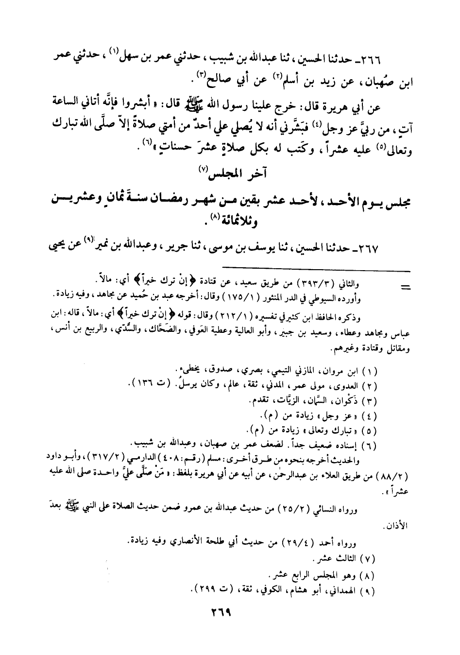 266 - حَدَّثَنَا الْحُسَيْنُ ثنا عَبْدُ اللَّهِ بْنُ شَبِيبٍ، حَدَّثَنِي عُمَرُ بْنُ سَهْلٍ، حَدَّثَنِي عُمَرُ بْنُ صُهْبَانَ، عَنْ زَيْدِ بْنِ أَسْلَمَ، عَنْ أَبِي صَالِحٍ، عَنْ أَبِي هُرَيْرَةَ قَالَ: خَرَجَ عَلَيْنَا رَسُولُ اللَّهِ صَلَّى اللهُ عَلَيْهِ وَسَلَّمَ قَالَ: «§أَبْشِرُوا؛ فَإِنَّهُ أَتَانِي السَّاعَةَ آتٍ مِنْ رَبِّي عَزَّ وَجَلَّ , فَبَشَّرَنِي أَنَّهُ لَا يُصَلِّي عَلَيَّ أَحَدٌ مِنْ أُمَّتِي صَلَاةً إِلَّا صَلَّى اللَّهُ تَبَارَكَ وَتَعَالَى عَلَيْهِ عَشْرًا , وَكَتَبَ لَهُ بِكُلِّ صَلَاةٍ عَشْرَ حَسَنَاتٍ»