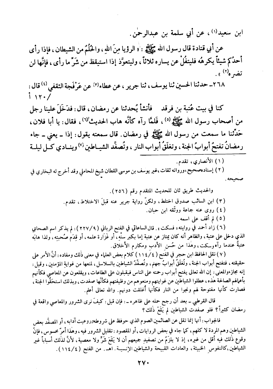 268 - حَدَّثَنَا الْحُسَيْنُ ثنا يُوسُفُ، ثنا جَرِيرٌ، عَنْ عَطَاءٍ، عَنْ عَرْفَجَةَ الثَّقَفِيِّ قَالَ: كُنَّا فِي بَيْتِ عُتْبَةَ بْنِ فَرْقَدٍ , فَأَنْشَأَ يُحَدِّثُنَا عَنْ رَمَضَانَ قَالَ: فَدَخَلَ عَلَيْنَا رَجُلٌ مِنْ أَصْحَابِ رَسُولِ اللَّهِ صَلَّى اللهُ عَلَيْهِ وَسَلَّمَ , فَلَمَّا رَآهُ كَأَنَّهُ هَابَ الْحَدِيثَ , فَقَالَ: يَا أَبَا فُلَانٍ , حَدِّثْنَا مَا سَمِعْتَ مِنْ رَسُولِ اللَّهِ صَلَّى اللهُ عَلَيْهِ وَسَلَّمَ فِي رَمَضَانَ، قَالَ: سَمِعْتُهُ يَقُولُ: " §إِذَا ـ يَعْنِي ـ جَاءَ رَمَضَانُ تُفْتَحُ أَبْوَابُ الْجَنَّةِ، وَتُغْلَقُ أَبْوَابُ النَّارِ، وَتُصَفَّدُ الشَّيَاطِينُ، وَيُنَادِي كُلَّ لَيْلَةٍ -[271]- مُنَادٍ: يَا بَاغِيَ الْخَيْرِ هَلُمَّ، وَيَا بَاغِيَ الشَّرِّ أَقْصِرْ، حَتَّى يَنْقَضِيَ رَمَضَانُ "