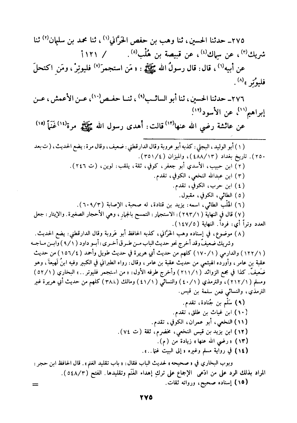 275 - حَدَّثَنَا الْحُسَيْنُ ثنا وَهْبُ بْنُ حَفْصٍ الْحَرَّانِيُّ، , ثنا مُحَمَّدُ بْنُ سُلَيْمَانَ، ثنا شَرِيكٌ، عَنْ سِمَاكٍ، عَنْ قَبِيصَةَ بْنِ هُلْبٍ، عَنْ أَبِيهِ قَالَ: قَالَ رَسُولُ اللَّهِ صَلَّى اللهُ عَلَيْهِ وَسَلَّمَ: «§مَنِ اسْتَجْمَرَ فَلْيُوتِرْ , وَمَنِ اكْتَحَلَ فَلْيُوتِرْ»