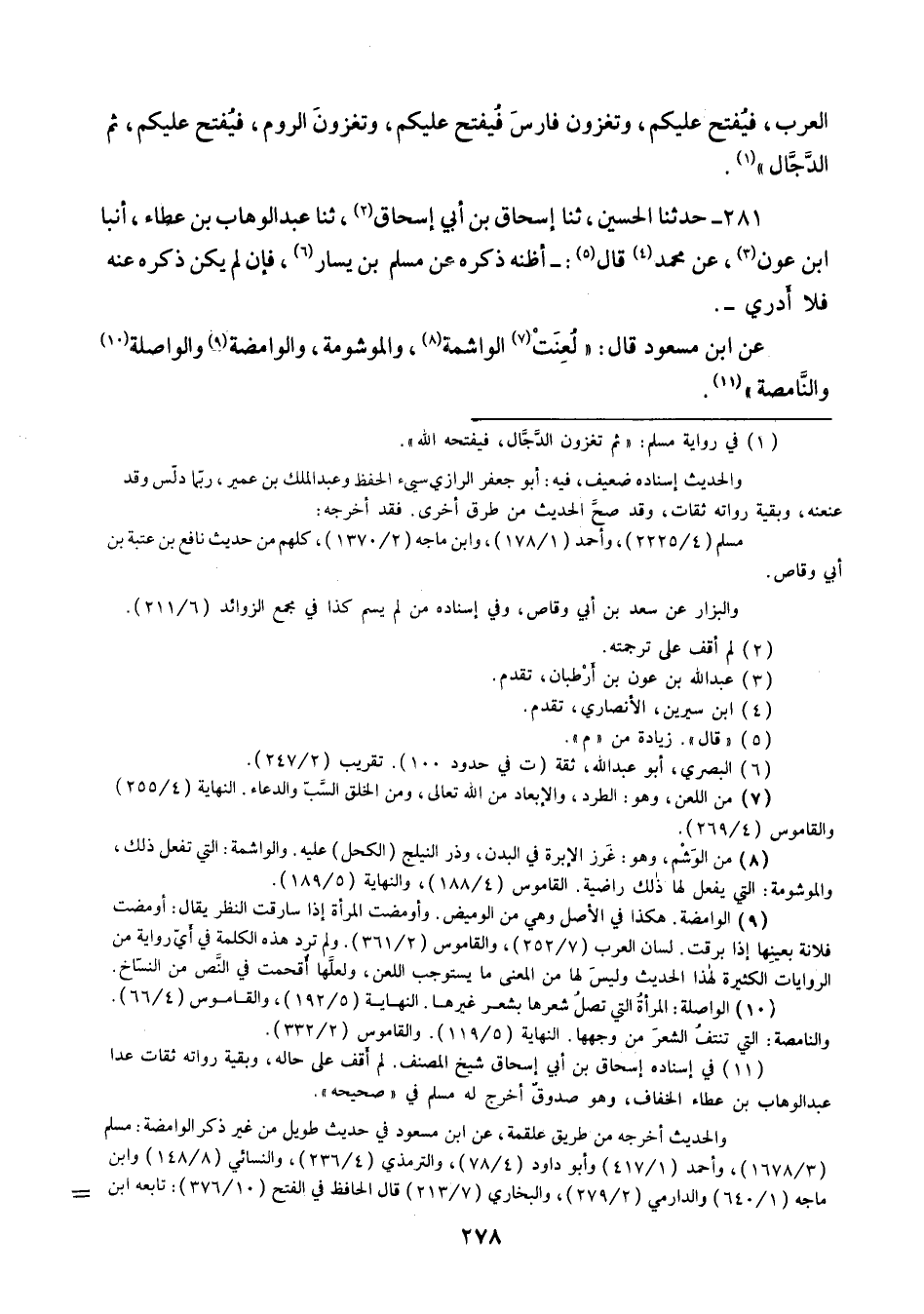 281 - حَدَّثَنَا الْحُسَيْنُ ثنا إِسْحَاقُ بْنُ أَبِي إِسْحَاقَ، ثنا عَبْدُ الْوَهَّابِ بْنُ عَطَاءٍ، أَنْبَأَ ابْنُ عَوْنٍ، , عَنْ مُحَمَّدٍ قَالَ: أَظُنُّهُ ذَكَرَهُ عَنْ مُسْلِمِ بْنِ يَسَارٍ، فَإِنْ لَمْ يَكُنْ ذَكَرَهُ عَنْهُ فَلَا أَدْرِي عَنِ ابْنِ مَسْعُودٍ قَالَ: «§لُعِنَتِ الْوَاشِمَةُ وَالْمَوْشُومَةُ , وَالْوَامِضَةُ , وَالْوَاصِلَةُ , وَالنَّامِصَةُ»