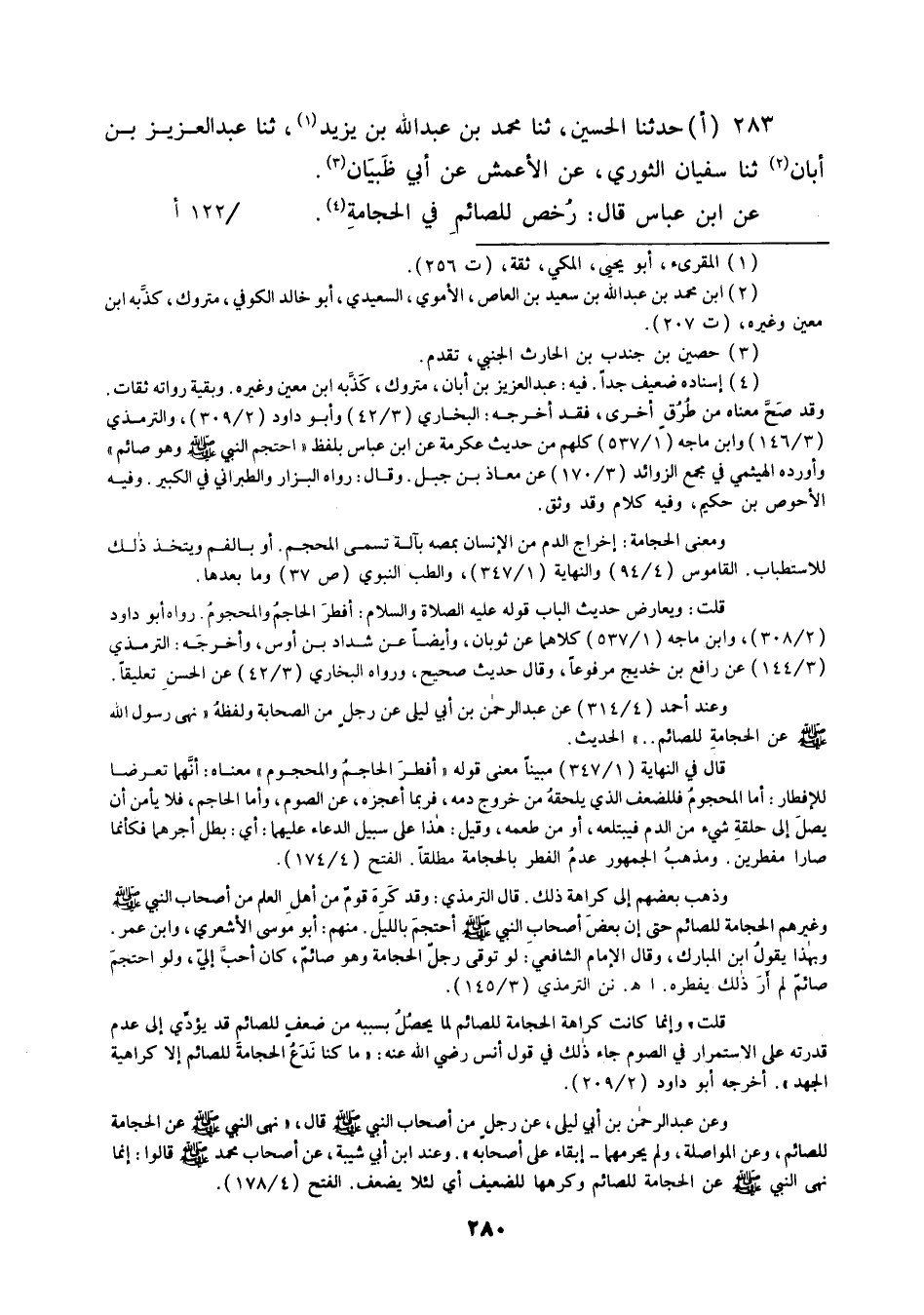 حَدَّثَنَا الْحُسَيْنُ ثنا مُحَمَّدُ بْنُ عَبْدِ اللَّهِ بْنِ يَزِيدَ، ثنا عَبْدُ الْعَزِيزِ بْنُ أَبَانَ، ثنا سُفْيَانُ الثَّوْرِيُّ، عَنِ الْأَعْمَشِ، عَنْ أَبِي ظَبْيَانَ، عَنِ ابْنِ عَبَّاسٍ قَالَ: «§رُخِّصَ لِلصَّائِمِ فِي الْحِجَامَةِ»