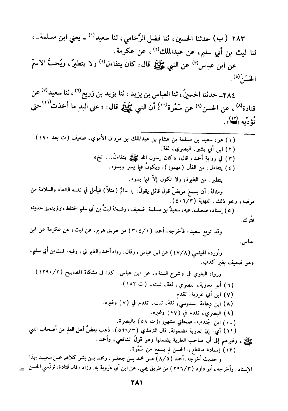 حَدَّثَنَا الْحُسَيْنُ ثنا فَضْلٌ الرُّخَامِيُّ، ثنا سَعِيدٌ يَعْنِي ابْنَ مَسْلَمَةَ، ثنا لَيْثُ بْنُ أَبِي سُلَيْمٍ، عَنْ عَبْدِ الْمَلِكِ، عَنْ عِكْرِمَةَ، عَنِ ابْنِ عَبَّاسٍ عَنِ النَّبِيِّ صَلَّى اللهُ عَلَيْهِ وَسَلَّمَ قَالَ: «كَانَ §يَتَفَاءَلُ , وَلَا يَتَطَيَّرُ , وَيُحِبُّ الِاسْمَ الْحَسَنَ»