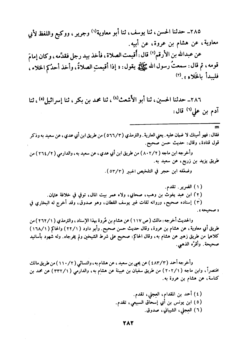 285 - حَدَّثَنَا الْحَسَنُ، ثنا يُوسُفُ، ثنا أَبُو مُعَاوِيَةَ، وَجَرِيرٌ، وَوَكِيعٌ، وَاللَّفْظُ لِأَبِي مُعَاوِيَةَ , عَنْ هِشَامِ بْنِ عُرْوَةَ، عَنْ أَبِيهِ، عَنْ عَبْدِ اللَّهِ بْنِ الْأَرْقَمِ قَالَ: أُقِيمَتِ الصَّلَاةُ , فَأَخَذَ بِيَدِ رَجُلٍ فَقَدَّمَهُ , وَكَانَ إِمَامَ قَوْمِهِ , ثُمَّ قَالَ: سَمِعْتُ رَسُولَ اللَّهِ صَلَّى اللهُ عَلَيْهِ وَسَلَّمَ يَقُولُ: «§إِذَا أُقِيمَتِ الصَّلَاةُ , وَأَخَذَ أَحَدُكُمُ الْخَلَاءَ , فَلْيَبْدَأْ بِالْخَلَاءِ»