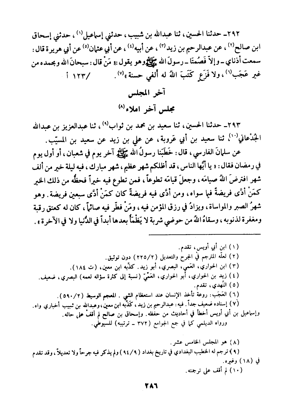 293 - حَدَّثَنَا الْحُسَيْنُ ثنا سَعِيدُ بْنُ مُحَمَّدِ بْنِ ثَوَابٍ، ثنا عَبْدُ الْعَزِيزِ بْنُ عَبْدِ اللَّهِ الْجُدْعَانِيُّ، ثنا سَعِيدُ بْنُ أَبِي عَرُوبَةَ، عَنْ عَلِيِّ بْنِ زَيْدٍ، عَنْ سَعِيدِ بْنِ الْمُسَيِّبِ، عَنْ سَلْمَانَ الْفَارِسِيِّ قَالَ: خَطَبَنَا رَسُولُ اللَّهِ صَلَّى اللهُ عَلَيْهِ وَسَلَّمَ آخِرَ يَوْمٍ فِي شَعْبَانَ أَوْ أَوَّلَ يَوْمٍ فِي رَمَضَانَ , فَقَالَ: «يَا أَيُّهَا النَّاسُ , قَدْ §أَظَلَّكُمْ شَهْرٌ عَظِيمٌ شَهْرٌ مُبَارَكٌ فِيهِ لَيْلَةٌ خَيْرٌ مِنْ أَلْفِ شَهْرٍ , افْتَرَضَ اللَّهُ صِيَامَهُ , وَجَعَلَ قِيَامَهُ تَطَوُّعًا , فَمَنْ تَطَوَّعَ فِيهِ خَيْرًا فَحَظُّهُ مِنْ ذَلِكَ الْخَيْرِ كَمَنْ أَدَّى فَرِيضَةً فِيمَا سِوَاهُ , وَمَنْ أَدَّى فِيهِ فَرِيضَةً كَانَ كَمَنْ أَدَّى سَبْعِينَ فَرِيضَةً وَهُوَ شَهْرُ الصَّبْرِ وَالْمُوَاسَاةِ , وَيُزَادُ فِي رِزْقِ الْمُؤْمِنِ فِيهِ , وَمَنْ فَطَّرَ فِيهِ صَائِمًا كَانَ لَهُ كَعِتْقِ رَقَبَةٍ وَمَغْفِرَةٍ لِذُنُوبِهِ , وَسَقَاهُ اللَّهُ مِنْ حَوْضِي شَرْبَةً لَا يَظْمَأُ بَعْدَهَا أَبَدًا فِي الدُّنْيَا وَلَا فِي الْآخِرَةِ» -[287]- قَالَ: قُلْنَا يَا رَسُولَ اللَّهِ , لَيْسَ كُلُّنَا نَجِدُ مَا يُفَطِّرُ الصَّائِمَ , فَقَالَ: " يُعْطِي اللَّهُ الثَّوَابَ مَنْ فَطَّرَ صَائِمًا عَلَى مَذْقَةِ لَبَنٍ أَوْ تَمْرَةٍ أَوْ أَشْبَعَ جَائِعًا سَقَاهُ اللَّهُ مِنْ حَوْضِي شَرْبَةً لَا يَظْمَأُ بَعْدَهَا فِي الدُّنْيَا وَلَا فِي الْآخِرَةِ , وَمَنْ خَفَّفَ عَنْ مَمْلُوكِهِ فِيهِ أَعْتَقَهُ اللَّهُ مِنَ النَّارِ , وَهُوَ شَهْرٌ أَوَّلُهُ رَحْمَةٌ , وَأَوْسَطُهُ مَغْفِرَةٌ , وَآخِرَهُ عِتْقٌ مِنَ النَّارِ وَهُوَ شَهْرٌ لَا غَنَاءَ بِكُمْ عَنْ أَرْبَعِ خِصَالٍ: خَصْلَتَانِ تَرْضَوْنَ بِهَا رَبَّكُمْ , وَخَصْلَتَانِ لَا غَنَاءَ بِكُمْ عَنْهُمَا , فَأَمَّا الْخَصْلَتَانِ اللَّتَانِ تُرْضُونَ بِهِمَا رَبَّكُمْ: فَشَهَادَةُ أَنْ لَا إِلَهَ إِلَّا اللَّهُ , وَأَنَّ مُحَمَّدًا عَبْدُهُ وَرَسُولُهُ , وَأَمَّا الْخَصْلَتَانِ اللَّتَانِ لَا غَنَاءَ بِكُمْ عَنْهُمَا: تَسْتَغْفِرُونَ اللَّهَ بِاللَّيْلِ وَالنَّهَارِ وَتَسْتَعِيذُونَ بِاللَّهِ مِنَ النَّارِ "