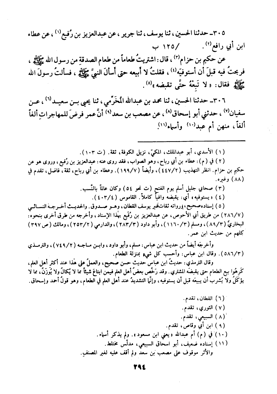 305 - حَدَّثَنَا الْحُسَيْنُ ثنا يُوسُفُ، ثنا جَرِيرٌ، عَنْ عَبْدِ الْعَزِيزِ بْنِ رُفَيْعٍ، عَنْ عَطَاءِ بْنِ أَبِي رَافِعٍ، عَنْ حَكِيمِ بْنِ حِزَامٍ قَالَ: اشْتَرَيْتُ طَعَامًا مِنْ طَعَامِ الصَّدَقَةِ مِنْ رَسُولِ اللَّهِ صَلَّى اللهُ عَلَيْهِ وَسَلَّمَ , فَرَبِحْتُ فِيهِ قَبْلَ أَنْ أَسْتَوْفِيَهُ , فَقُلْتُ: لَا أَبِيعُهُ حَتَّى أَسْأَلَ النَّبِيَّ صَلَّى اللهُ عَلَيْهِ وَسَلَّمَ , فَسَأَلْتُ رَسُولَ اللَّهِ صَلَّى اللهُ عَلَيْهِ وَسَلَّمَ , فَقَالَ: «§لَا تَبِعْهُ حَتَّى تَقْبِضَهُ»