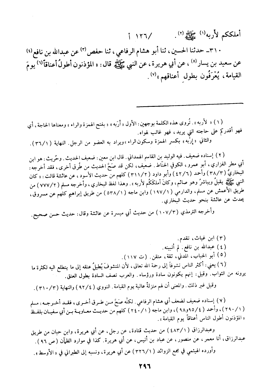 310 - حَدَّثَنَا الْحُسَيْنُ ثنا أَبُو هِشَامٍ الرِّفَاعِيُّ، ثنا حَفْصٌ، عَنْ عَبْدِ اللَّهِ بْنِ نَافِعٍ، عَنْ سَعِيدِ بْنِ يَسَارٍ، عَنْ أَبِي هُرَيْرَةَ عَنِ النَّبِيِّ صَلَّى اللهُ عَلَيْهِ وَسَلَّمَ قَالَ: «§الْمُؤَذِّنُونَ أَطْوَلُ أَعْنَاقًا يَوْمَ الْقِيَامَةِ يُعْرَفُونَ بِطُولِ أَعْنَاقِهِمْ»