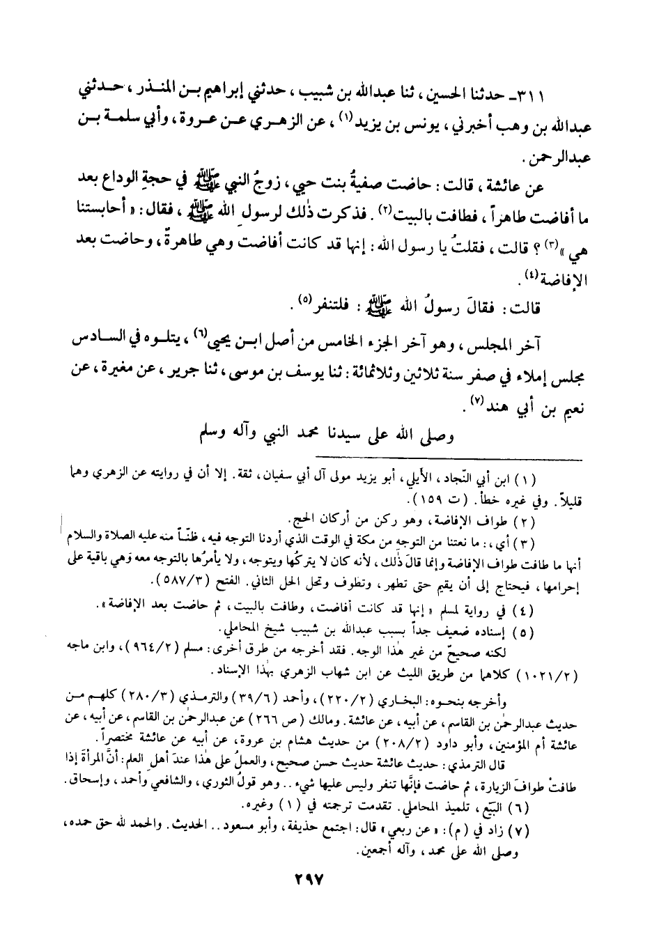 311 - حَدَّثَنَا الْحُسَيْنُ ثنا عَبْدُ اللَّهِ بْنُ شَبِيبٍ، حَدَّثَنِي إِبْرَاهِيمُ بْنُ الْمُنْذِرِ، حَدَّثَنِي عَبْدُ اللَّهِ بْنُ وَهْبٍ، أَخْبَرَنِي يُونُسُ بْنُ يَزِيدَ، عَنِ الزُّهْرِيِّ، عَنْ عُرْوَةَ، وَأَبِي سَلَمَةَ بْنِ عَبْدِ الرَّحْمَنِ , عَنْ عَائِشَةَ قَالَتْ: حَاضَتْ صَفِيَّةُ بِنْتُ حُيَيٍّ زَوْجُ النَّبِيِّ صَلَّى اللهُ عَلَيْهِ وَسَلَّمَ فِي حَجَّةِ الْوَدَاعِ بَعْدَ مَا أَفَاضَتْ طَاهِرًا , فَطَافَتْ بِالْبَيْتِ , فَذَكَرَتْ ذَلِكَ لِرَسُولِ اللَّهِ صَلَّى اللهُ عَلَيْهِ وَسَلَّمَ , فَقَالَ: «§أَحَابِسَتُنَا هِيَ؟» قَالَتْ: فَقُلْتُ: يَا رَسُولَ اللَّهِ , إِنَّهَا قَدْ كَانَتْ أَفَاضَتْ وَهِيَ طَاهِرَةٌ وَحَاضَتْ بَعْدَ الْإِفَاضَةِ قَالَتْ: فَقَالَ: رَسُولُ اللَّهِ صَلَّى اللهُ عَلَيْهِ وَسَلَّمَ: «فَلْتَنْفِرْ»