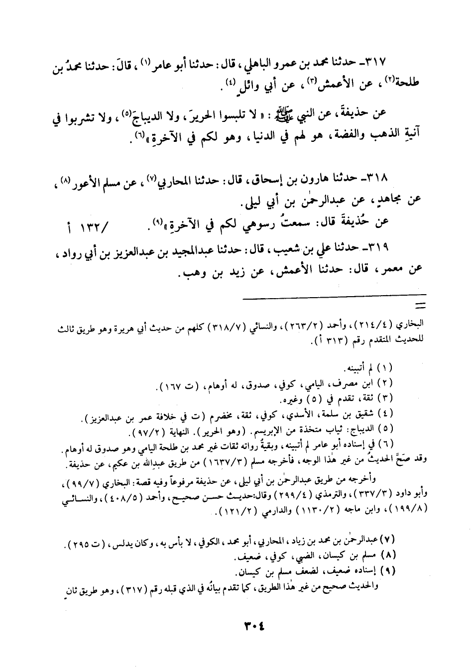 318 - حَدَّثَنَا هَارُونُ بْنُ إِسْحَاقَ قَالَ: حَدَّثَنَا الْمُحَارِبِيُّ، عَنْ مُسْلِمٍ الْأَعْوَرِ، عَنْ مُجَاهِدٍ، عَنْ عَبْدِ الرَّحْمَنِ بْنِ أَبِي لَيْلَى، عَنْ حُذَيْفَةَ قَالَ: سَمِعْتُ رَسُولَ اللَّهِ صَلَّى اللهُ عَلَيْهِ وَسَلَّمَ: يَقُولُ: «§لَا تَلْبَسُوا الْحَرِيرَ , وَلَا الدِّيبَاجَ , وَلَا تَشْرَبُوا فِي آنِيَةِ الذَّهَبِ وَالْفِضَّةِ؛ هُوَ لَهُمْ فِي الدُّنْيَا وَهُوَ لَكُمْ فِي الْآخِرَةِ»